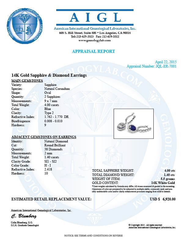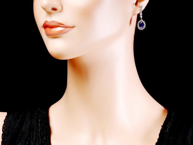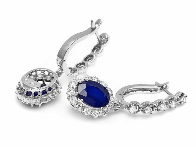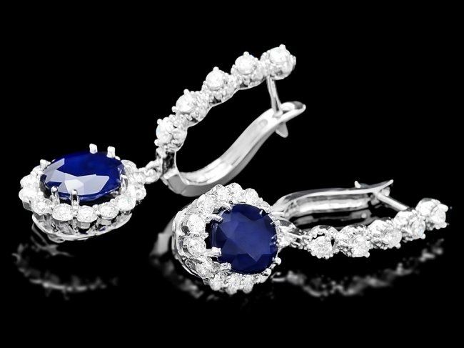 Retail: $6,800.00 ****** 14k Gold 4ct Sapphire 1.40ct Diamond Earrings ****** Metal: 14k Solid White Gold / Total Item Weight: 5.5 grams / Country Made: United States / / Main Stone: Sapphire / Color: Blue / Carat Total Weight: 4.00 / Treatment: Heating / Clarity: Type 2 / Cut: Very Good / / Secondary Stone: Diamond / Carat Total Weight: 1.40 / Treatment: None / Color Grade: H - I / Clarity: SI1 - SI2 / Cut: Very Good /