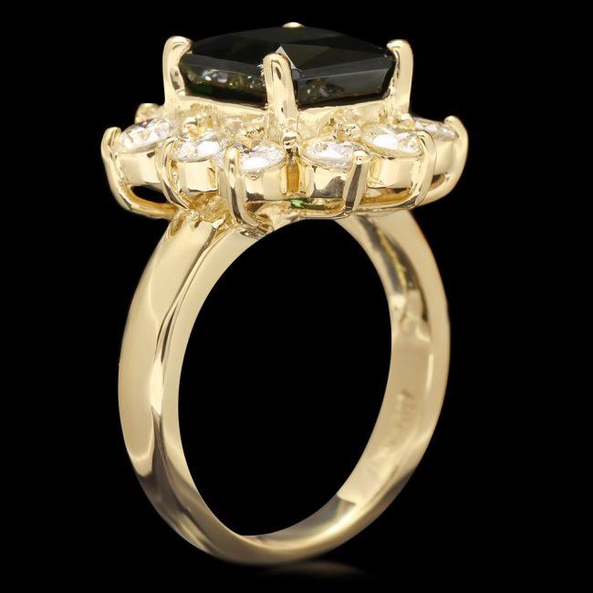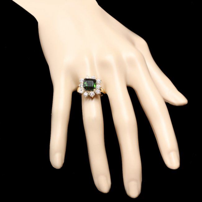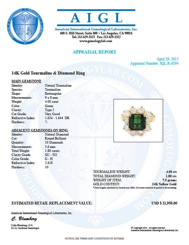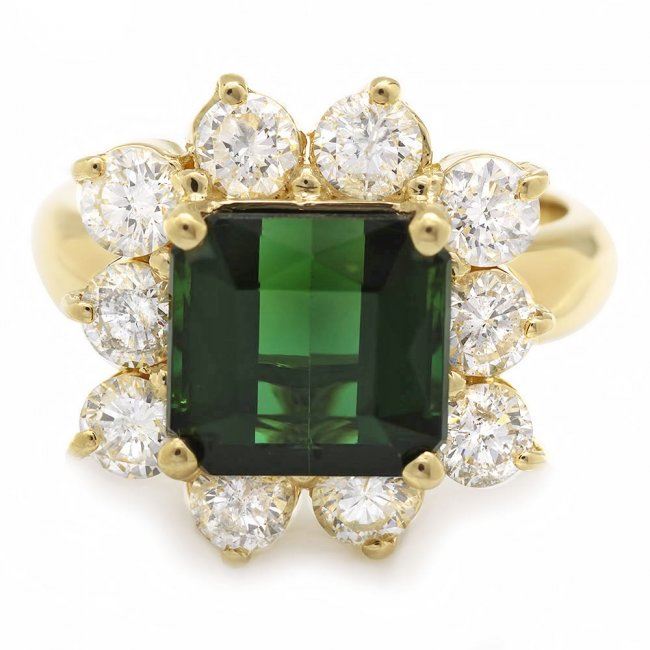 Retail: $11,890.00 ****** 14k Gold 4ct Tourmaline 1.80ct Diamond Ring ****** Metal: 14k Solid Yellow Gold / Size: 6.75 / Total Item Weight: 7.5 grams / Country Made: United States / / Main Stone: Tourmaline / Color: Green / Carat Total Weight: 4.00 / Treatment: None / Clarity: Type 2 / Cut: Very Good / / Secondary Stone: Diamond / Carat Total Weight: 1.80 / Treatment: None / Color Grade: G - H / Clarity: SI1 - SI2 / Cut: Very Good /