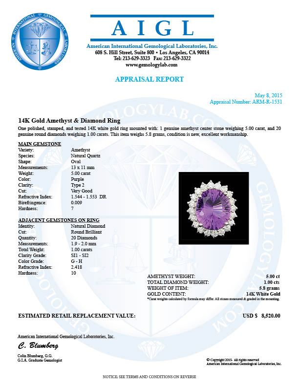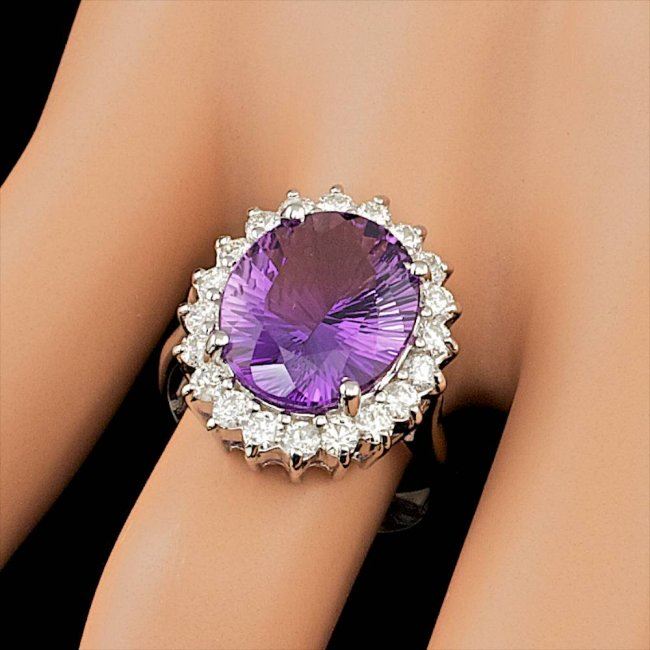 Retail: $8,400.00 ****** 14k Gold 5.00ct Amethyst 1.00ct Diamond Ring ****** Metal: 14k Solid White Gold / Size: 7 / Total Item Weight: 5.8 grams / Country Made: United States / / Main Stone: Amethyst / Color: Purple / Carat Total Weight: 5.00 / Treatment: None / Clarity: Type 2 / Cut: Very Good / / Secondary Stone: Diamond / Carat Total Weight: 1.00 / Treatment: None / Color Grade: G - H / Clarity: SI1 - SI2 / Cut: Very Good /