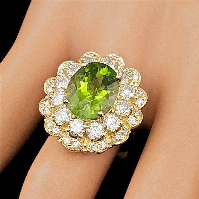 Retail: $17,800.00 ****** 14k Gold 5.50ct Peridot 2.30ct Diamond Ring ****** Metal: 14k Solid Yellow Gold / Size: 7 / Total Item Weight: 8.8 grams / Country Made: United States / / Main Stone: Peridot / Color: Green / Carat Total Weight: 5.50 / Treatment: None / Clarity: Type 2 / Cut: Very Good / / Secondary Stone: Diamond / Carat Total Weight: 2.30 / Treatment: None / Color Grade: G - H / Clarity: SI1 - SI2 / Cut: Very Good /