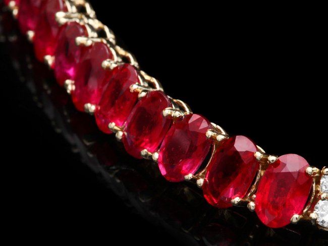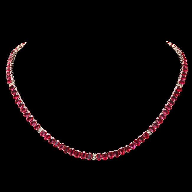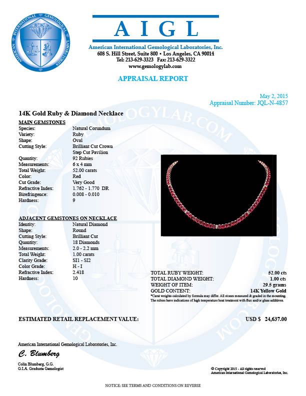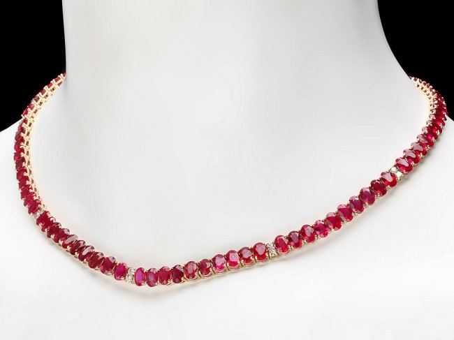Retail: $24,500.00 ****** 14k Gold 52.00ct Ruby 1.00ct Diamond Necklace ****** Metal: 14k Solid Yellow Gold / Size: 17 / Total Item Weight: 29.5 grams / Country Made: United States / / Main Stone: Ruby / Color: Red / Carat Total Weight: 52.00 / Treatment: Filling / Clarity: Type 2 / Cut: Very Good / / Secondary Stone: Diamond / Carat Total Weight: 1.00 / Treatment: None / Color Grade: H - I / Clarity: SI1 - SI2 / Cut: Very Good /