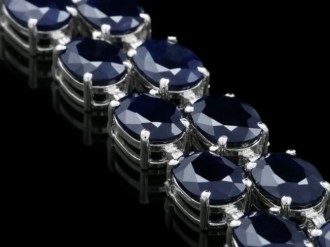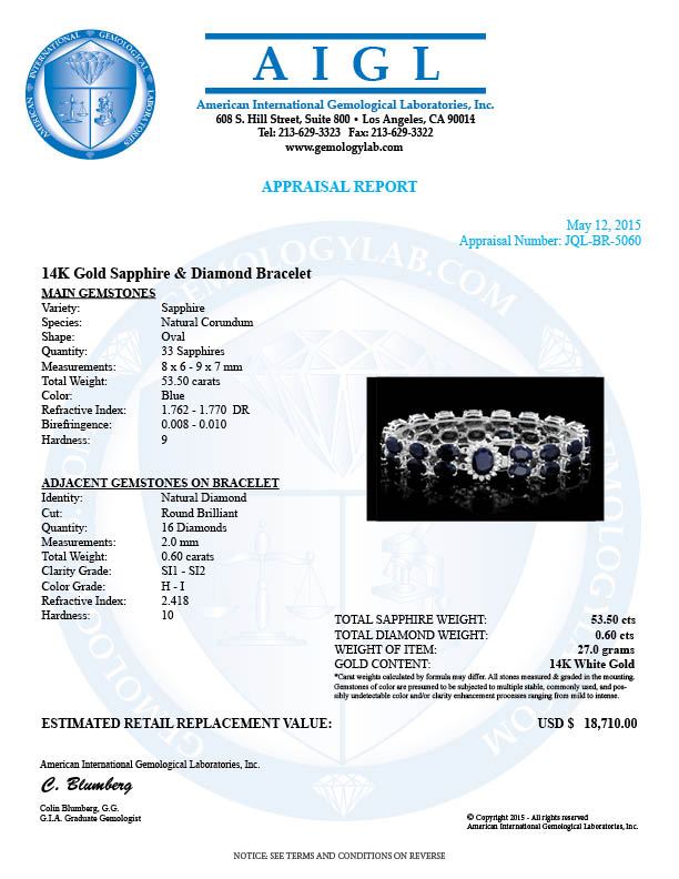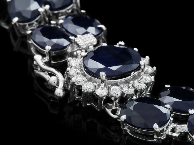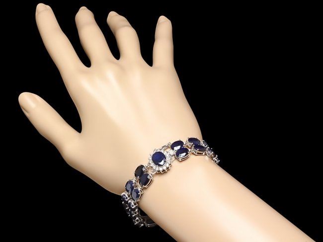 Retail: $18,600.00 ****** 14k Gold 53.5ct Sapphire 0.60ct Diamond Bracelet ****** Metal: 14k Solid White Gold / Size: 7.5 / Total Item Weight: 27 grams / Country Made: United States / / Main Stone: Sapphire / Color: Blue / Carat Total Weight: 1.50 / Treatment: Heating / Clarity: Type 2 / Cut: Very Good / / Secondary Stone: Diamond / Carat Total Weight: 0.60 / Treatment: None / Color Grade: H - I / Clarity: SI1 - SI2 / Cut: Very Good / / Side Stone: Sapphire / Color: Blue / Carat Total Weight: 52.00 / Treatment: Heating / Clarity: Type 2 / Cut: Very Good /