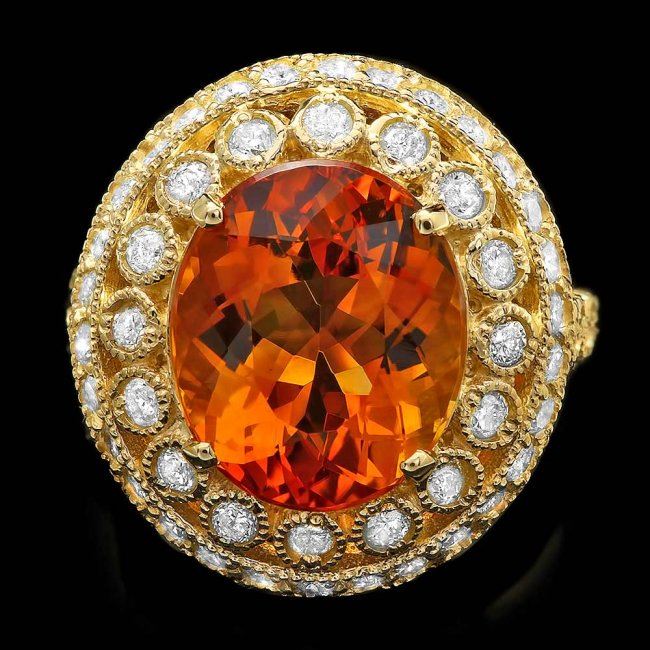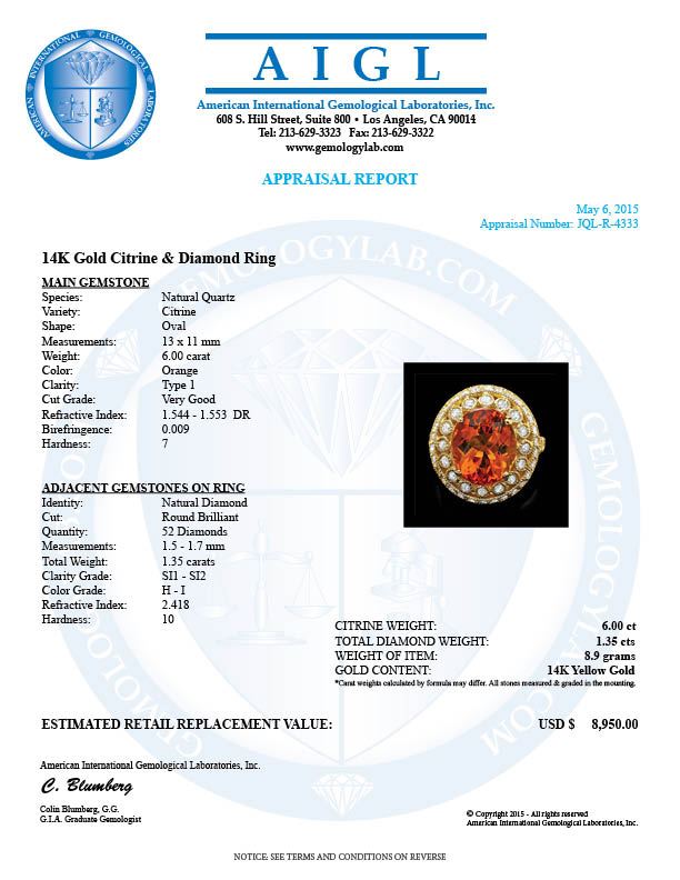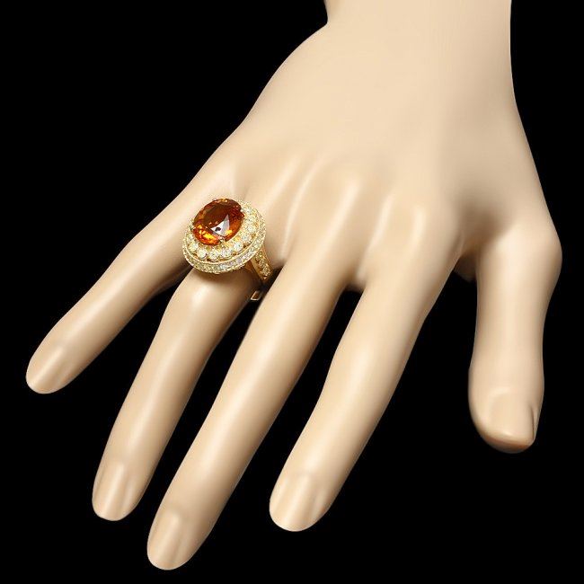 Retail: $8,850.00 ****** 14k Gold 6.00ct Citrine 1.35ct Diamond Ring ****** Metal: 14k Solid Yellow Gold / Size: 7.5 / Total Item Weight: 8.9 grams / Country Made: United States / / Main Stone: Citrine / Color: Orange / Carat Total Weight: 6.00 / Treatment: None / Clarity: Type 2 / Cut: Very Good / / Secondary Stone: Diamond / Carat Total Weight: 1.35 / Treatment: None / Color Grade: H - I / Clarity: SI1 - SI2 / Cut: Very Good /