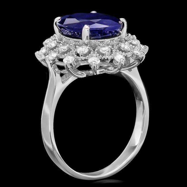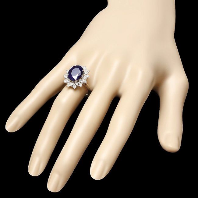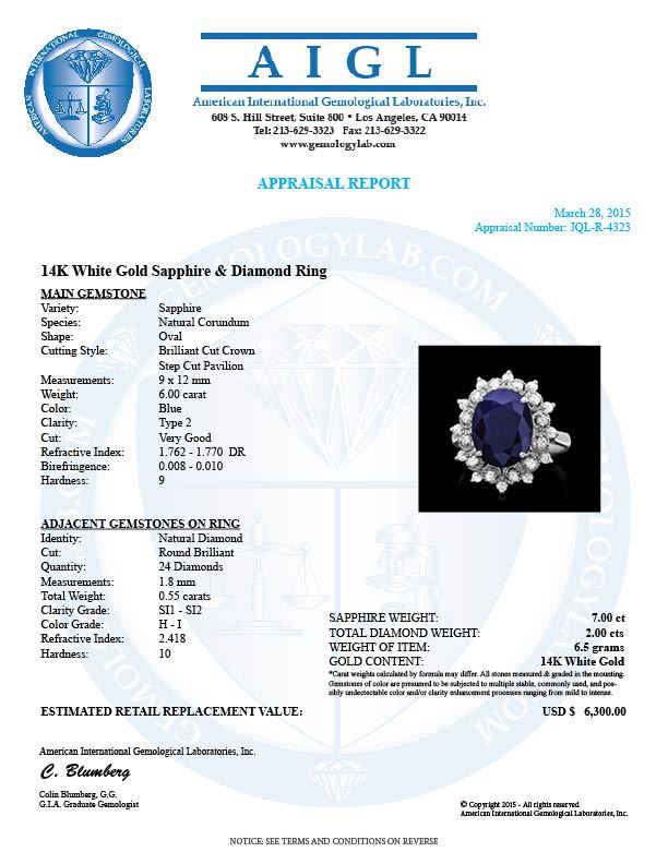 Retail: $6,300.00 ****** 14k Gold 6.00ct Sapphire 0.55ct Diamond Ring ****** Metal: 14k Solid White Gold / Size: 7.5 / Total Item Weight: 5.0 grams / Country Made: United States / / Main Stone: Sapphire / Color: Blue / Carat Total Weight: 6.00 / Treatment: Heating / Clarity: Type 2 / Cut: Very Good / / Secondary Stone: Diamond / Carat Total Weight: 0.55 / Treatment: None / Color Grade: H - I / Clarity: SI1 - SI2 / Cut: Very Good /