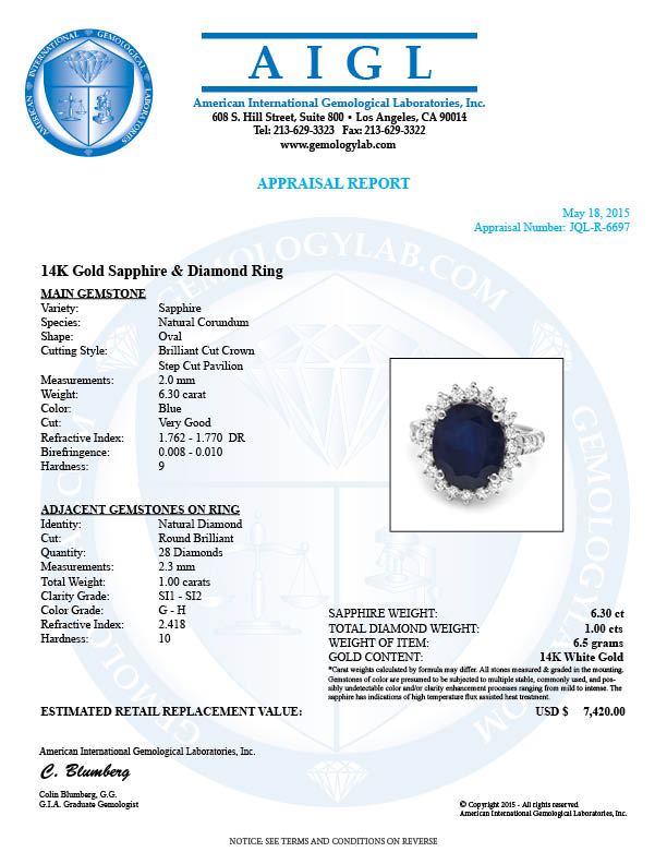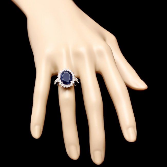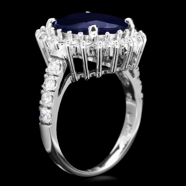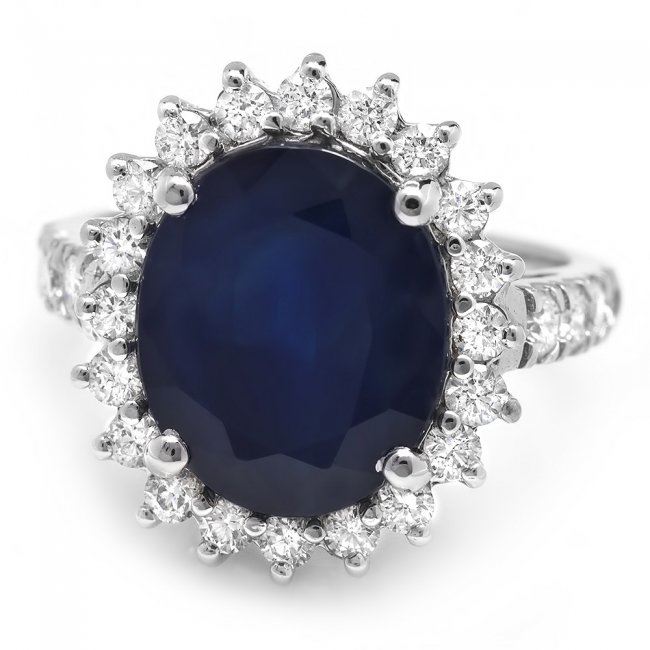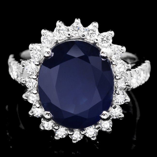 Retail: $7,300.00 ****** 14k Gold 6.30ct Sapphire 1.00ct Diamond Ring ****** Metal: 14k Solid White Gold / Size: 7 / Total Item Weight: 6.5 grams / Country Made: United States / / Main Stone: Sapphire / Color: Blue / Carat Total Weight: 6.30 / Treatment: Heating / Clarity: Type 2 / Cut: Very Good / / Secondary Stone: Diamond / Carat Total Weight: 1.00 / Treatment: None / Color Grade: G - H / Clarity: SI1 - SI2 / Cut: Very Good /