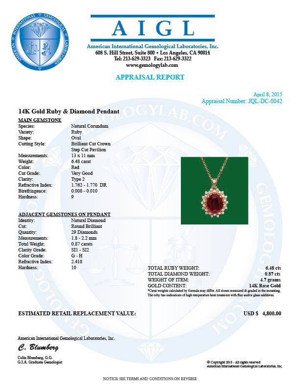 Retail: $4,800.00 ****** 14k Gold 6.48ct Ruby 0.87ct Diamond Pendant ****** Metal: 14k Solid Yellow Gold / Size: 7 / Total Item Weight: 4.7 grams / Country Made: United States / / Main Stone: Ruby / Color: Red / Treatment: None / Clarity: Type 2 / Cut: Very Good / Secondary Stone: Diamond / Carat Total Weight: 0.87 / Treatment: None / Color Grade: G - H / Clarity: SI1 - SI2 / Cut: Round Brilliant /