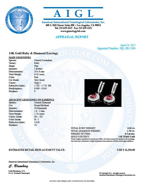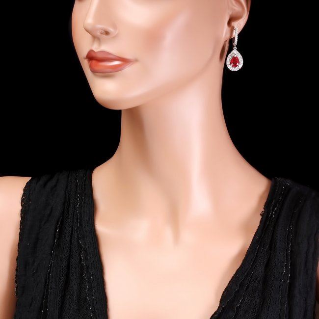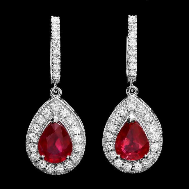 Retail: $11,200.00 ****** 14k Gold 6.50ct Ruby 1.70ct Diamond Earrings ****** Metal: 14k Solid White Gold / Total Item Weight: 8.5 grams / Country Made: United States / / Main Stone: Ruby / Color: Red / Carat Total Weight: 6.50 / Treatment: Filling / Clarity: Type 2 / Cut: Very Good / / Secondary Stone: Diamond / Carat Total Weight: 1.70 / Treatment: None / Color Grade: H - I / Clarity: SI1 - SI2 / Cut: Very Good /