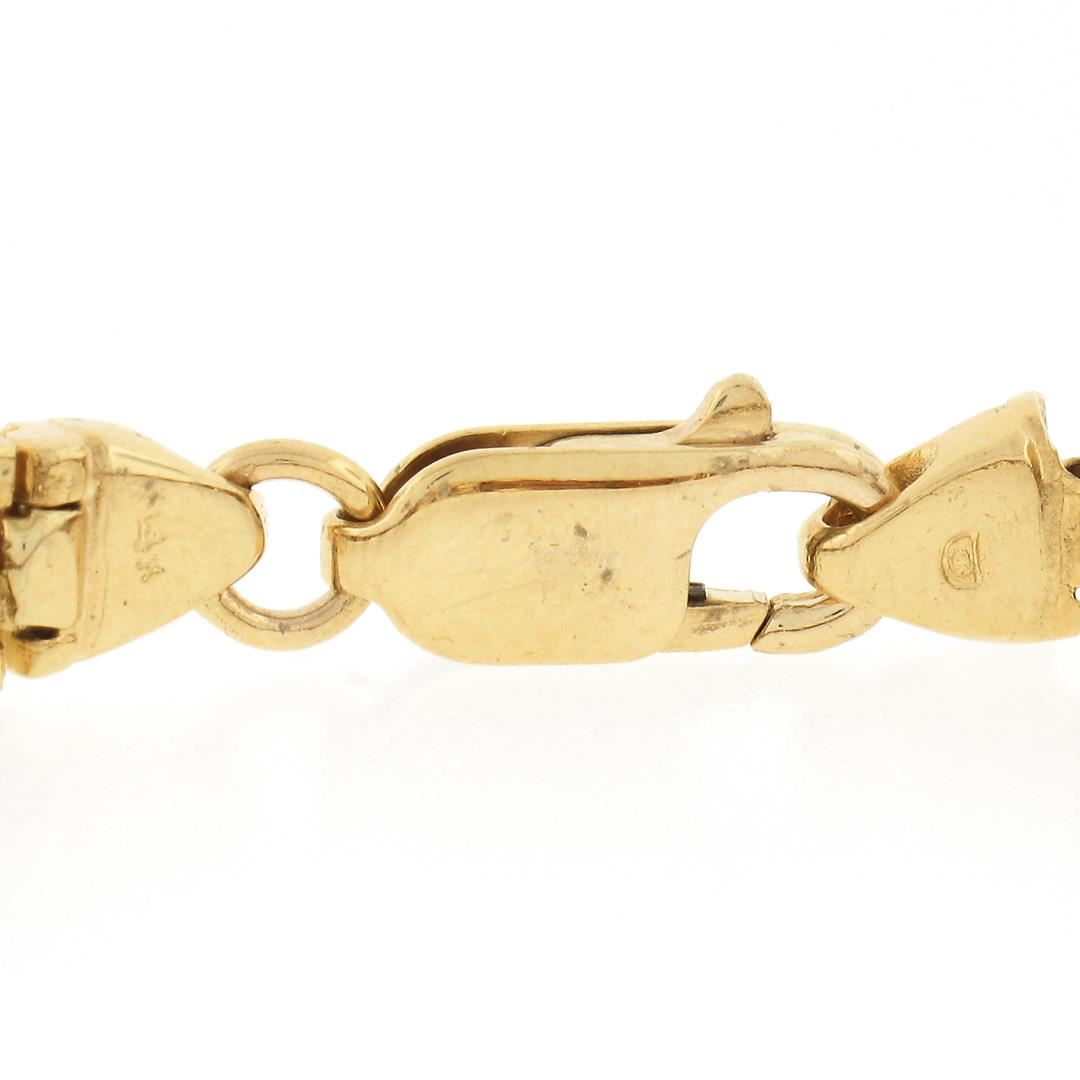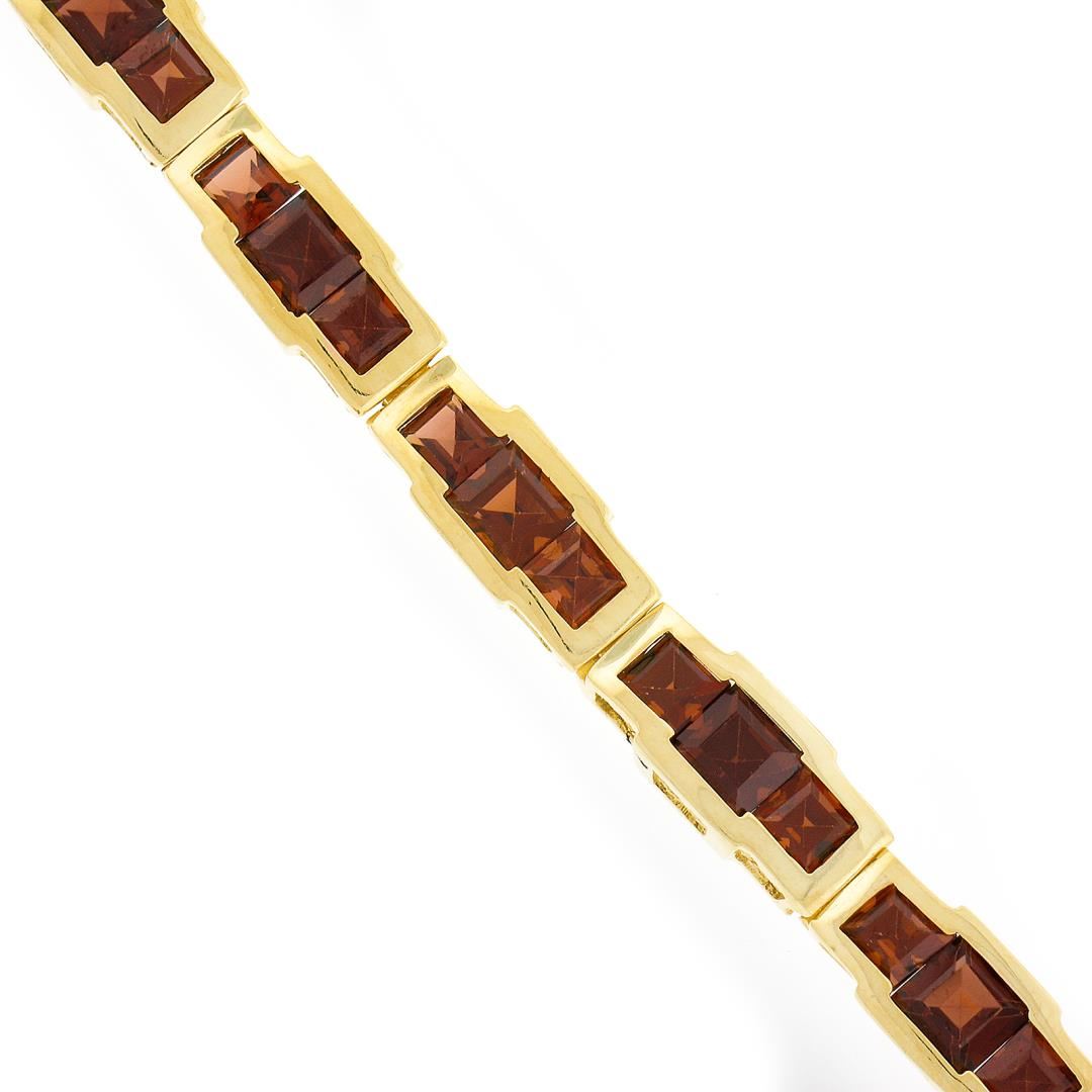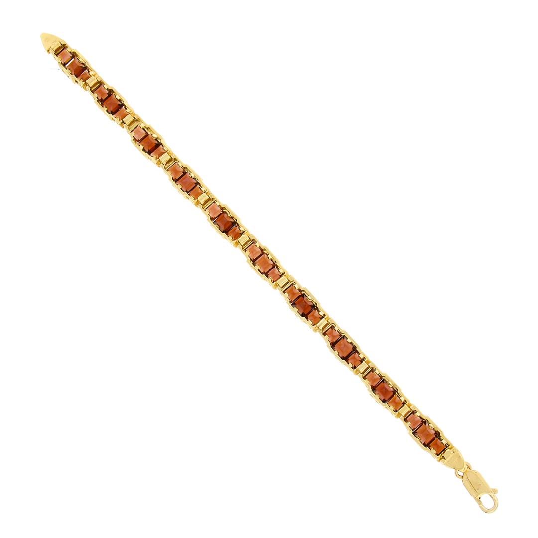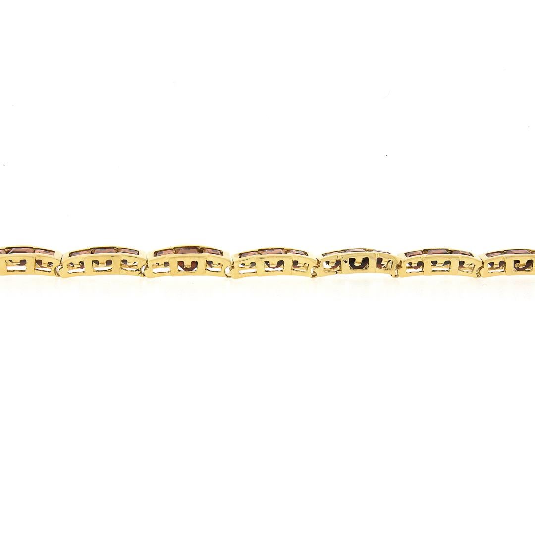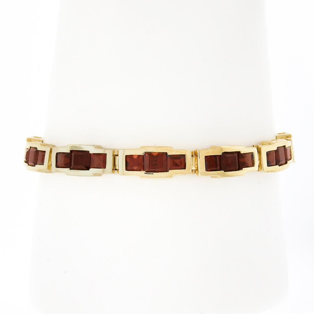A solid 14k yellow gold line bracelet, with 30 square step cut natural garnets (8.00ctw). It weighs a total of 18.36 grams, measures 7.20mm wide, and measures 6.75 inches in length.