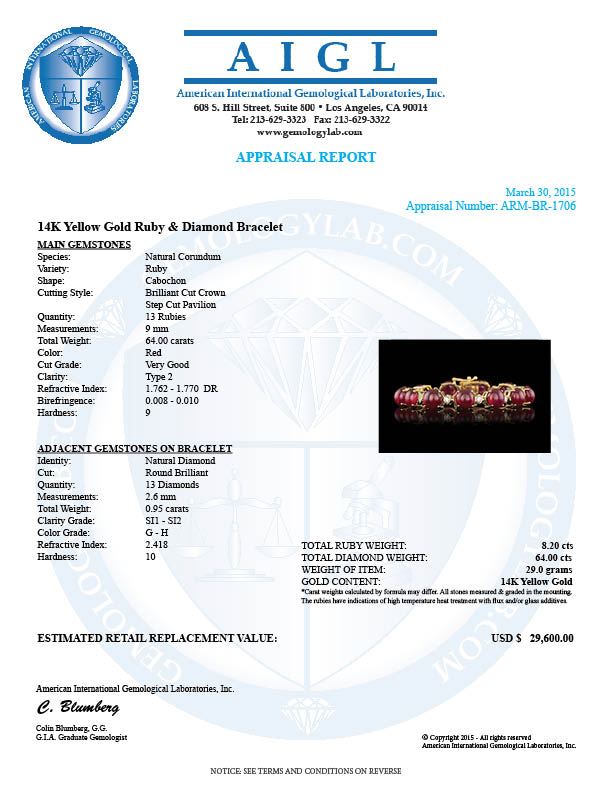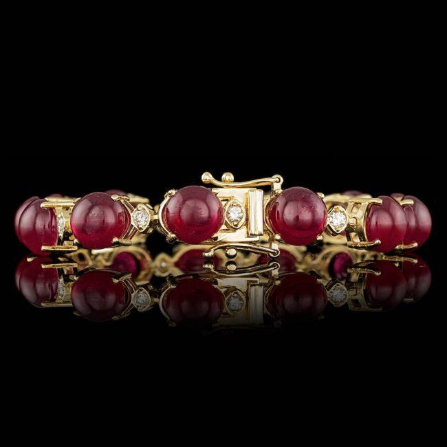 Retail: $29,600.00 ****** 14k Gold 64.00ct Ruby 0.95ct Diamond Bracelet ****** Metal: 14k Solid Yellow Gold / Size: 7 / Total Item Weight: 29.0 grams / Country Made: United States / / Main Stone: Ruby / Color: Red / Carat Total Weight: 64.00 / Treatment: Filling / Clarity: Type 2 / Cut: Very Good / / Secondary Stone: Diamond / Carat Total Weight: 0.95 / Treatment: None / Color Grade: G - H / Clarity: SI1 - SI2 / Cut: Very Good /