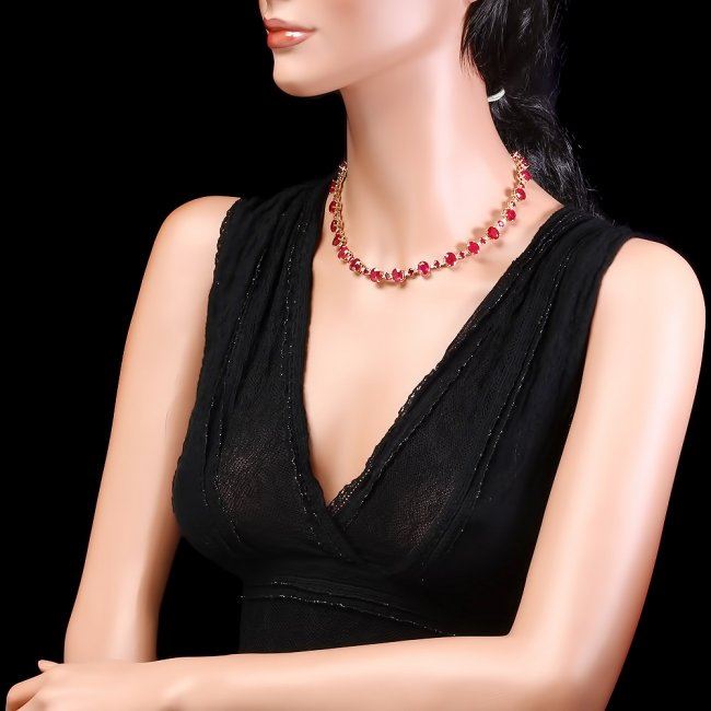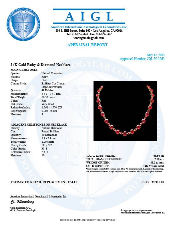Retail: $32,800.00 ****** 14k Gold 66.5ct Ruby 2.00ct Diamond Necklace ****** Metal: 14k Solid Yellow Gold / Size: 17 / Total Item Weight: 42.0 grams / Country Made: United States / / Main Stone: Ruby / Color: Red / Carat Total Weight: 52.00 / Treatment: Filling / Clarity: Type 2 / Cut: Very Good / / Secondary Stone: Diamond / Carat Total Weight: 2.00 / Treatment: None / Color Grade: H - I / Clarity: SI1 - SI2 / Cut: Very Good / / Side Stone: Ruby / Color: Red / Carat Total Weight: 14.50 / Treatment: Filling / Clarity: Type 2 / Cut: Very Good /