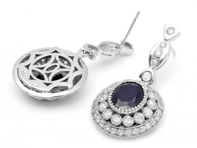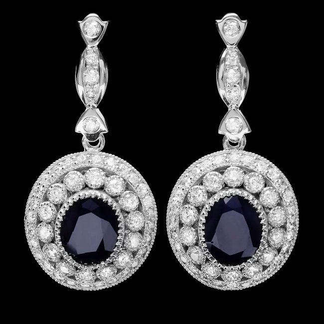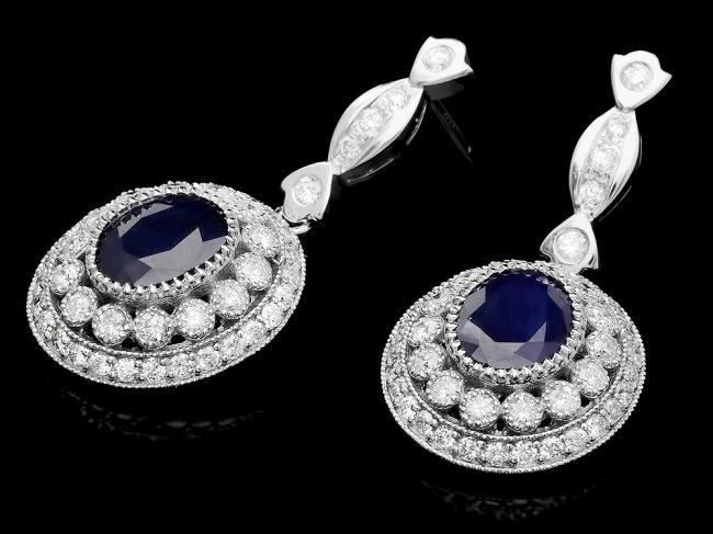 Retail: $10,600.00 ****** 14k Gold 6ct Sapphire 2.55ct Diamond Earrings ****** Metal: 14k Solid White Gold / Total Item Weight: 12.8 grams / Country Made: United States / / Main Stone: Sapphire / Color: Blue / Carat Total Weight: 6.00 / Treatment: Heating / Clarity: Type 2 / Cut: Very Good / / Secondary Stone: Diamond / Carat Total Weight: 2.55 / Treatment: None / Color Grade: G - H / Clarity: SI1 - SI2 / Cut: Very Good /