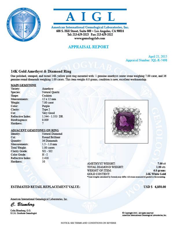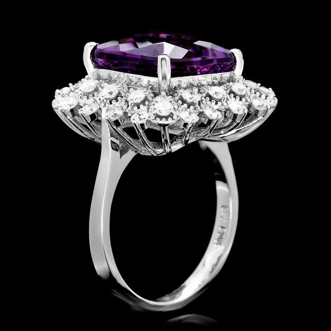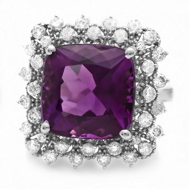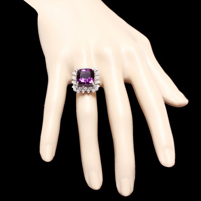 Retail: $6,900.00 ****** 14k Gold 7.00ct Amethyst 1.00ct Diamond Ring ****** Metal: 14k Solid White Gold / Size: 6.5 / Total Item Weight: 6.0 grams / Country Made: United States / / Main Stone: Amethyst / Color: Purple / Carat Total Weight: 7.00 / Treatment: None / Clarity: Type 2 / Cut: Very Good / / Secondary Stone: Diamond / Carat Total Weight: 1.00 / Treatment: None / Color Grade: H - I / Clarity: SI1 - SI2 / Cut: Very Good /