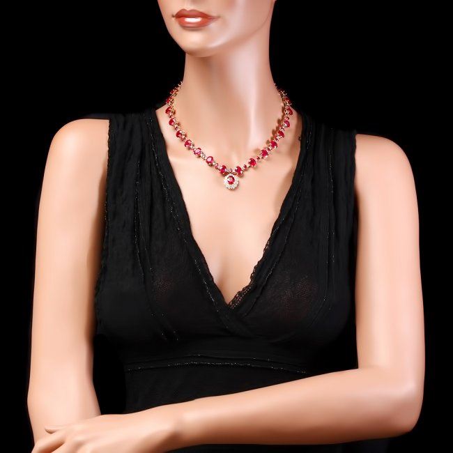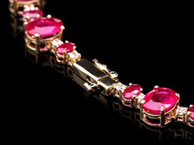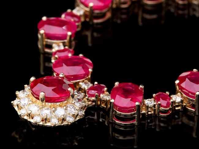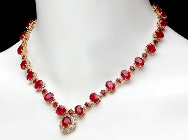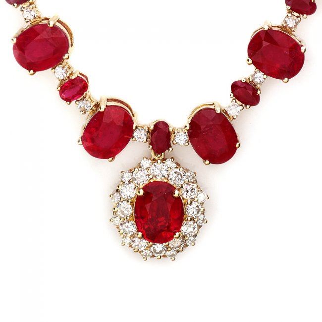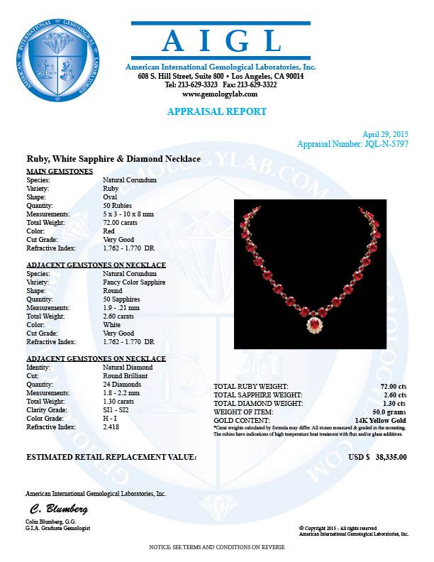 Retail: $38,250.00 ****** 14k Gold 72.00ct Ruby 1.30ct Diamond Necklace ****** Metal: 14k Solid Yellow Gold / Size: 17 / Total Item Weight: 50.0 grams / Country Made: United States / / Main Stone: Ruby / Color: Red / Carat Total Weight: 72.00 / Treatment: Filling / Clarity: Type 2 / Cut: Very Good / / Secondary Stone: Diamond / Carat Total Weight: 1.30 / Treatment: None / Color Grade: H - I / Clarity: SI1 - SI2 / Cut: Very Good / / Side Stone: Sapphire / Color: White / Carat Total Weight: 2.60 / Treatment: None / Clarity: Type 2 / Cut: Very Good /