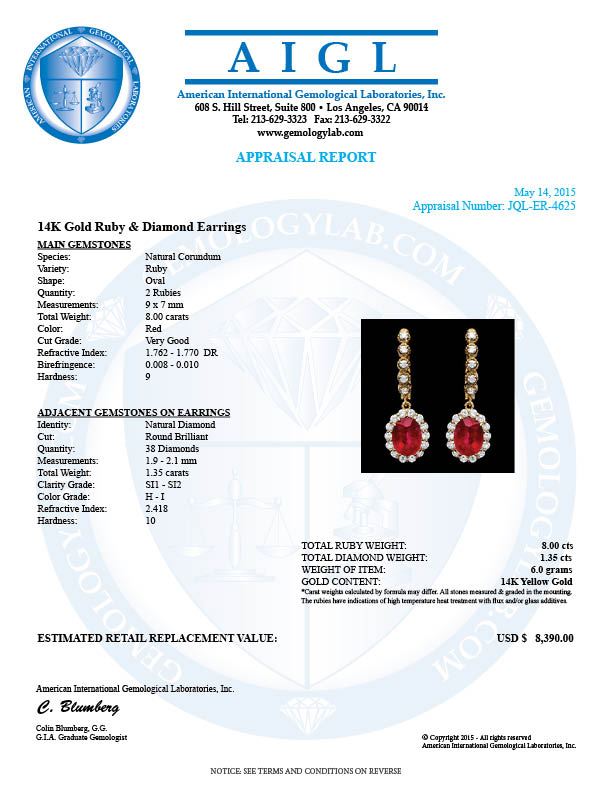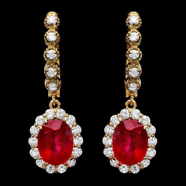 Retail: $8,300.00 ****** 14k Gold 8.00ct Ruby 1.35ct Diamond Earrings ****** Metal: 14k Solid Yellow Gold / Total Item Weight: 6 grams / Country Made: United States / / Main Stone: Ruby / Color: Red / Carat Total Weight: 8.00 / Treatment: Filling / Clarity: Type 2 / Cut: Very Good / / Secondary Stone: Diamond / Carat Total Weight: 1.35 / Treatment: None / Color Grade: H - I / Clarity: SI1 - SI2 / Cut: Very Good /