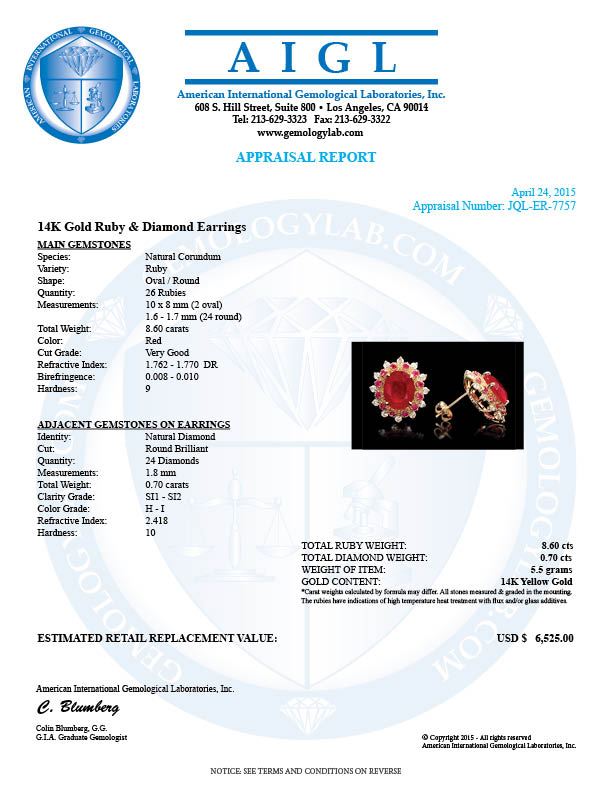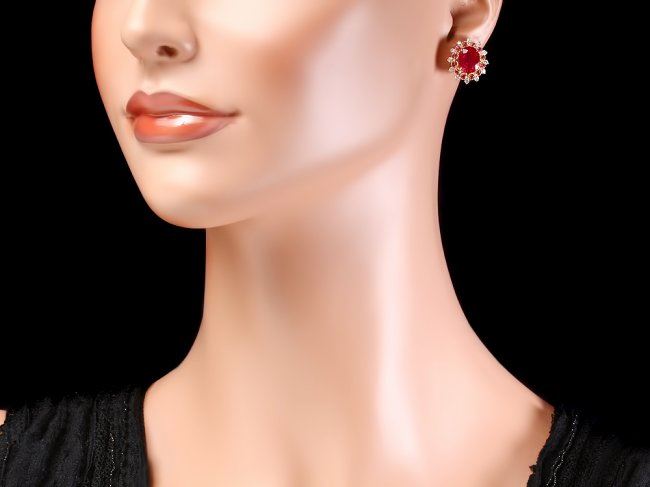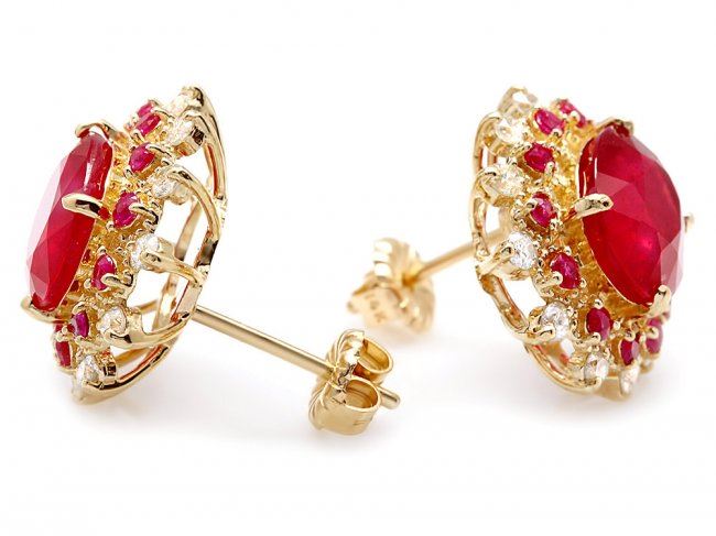 Retail: $6,400.00 ****** 14k Gold 8.6ct Ruby 0.70ct Diamond Earrings ****** Metal: 14k Solid Yellow Gold / Total Item Weight: 5.5 grams / Country Made: United States / / Main Stone: Ruby / Color: Red / Carat Total Weight: 8.00 / Treatment: Filling / Clarity: Type 2 / Cut: Very Good / / Secondary Stone: Diamond / Carat Total Weight: 0.70 / Treatment: None / Color Grade: H - I / Clarity: SI1 - SI2 / Cut: Very Good / / Side Stone: Ruby / Color: Red / Carat Total Weight: 0.60 / Treatment: None / Clarity: Type 2 / Cut: Very Good /