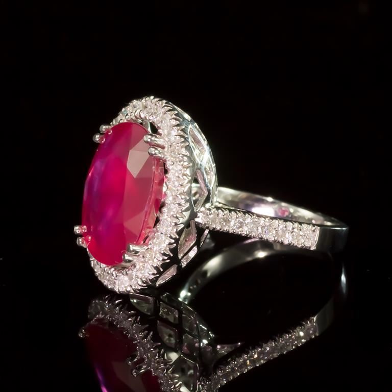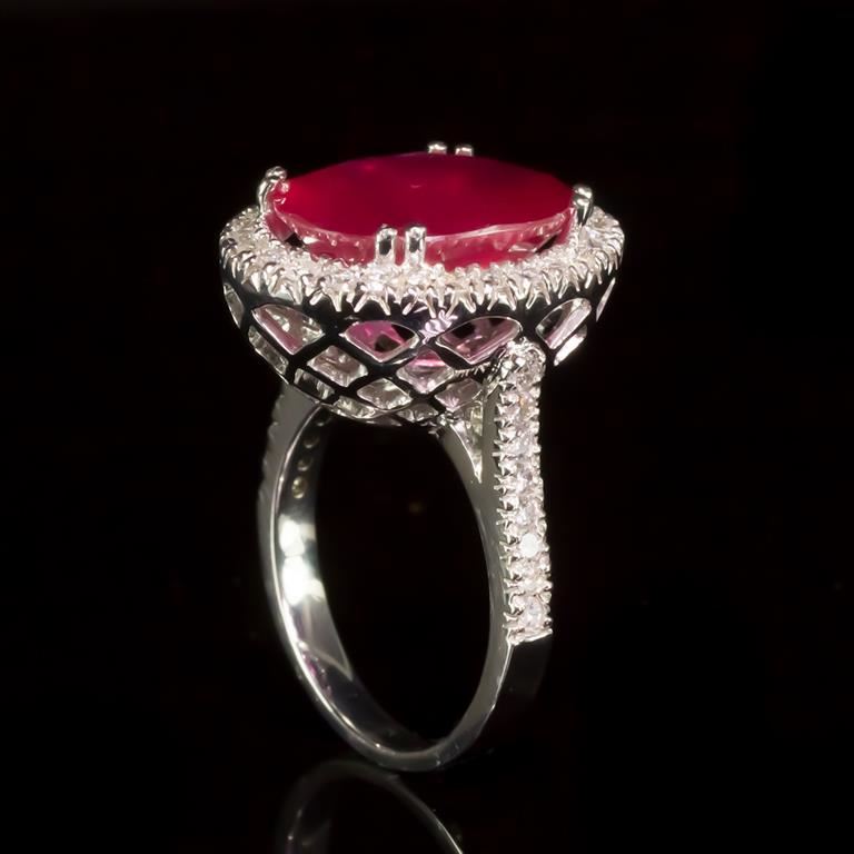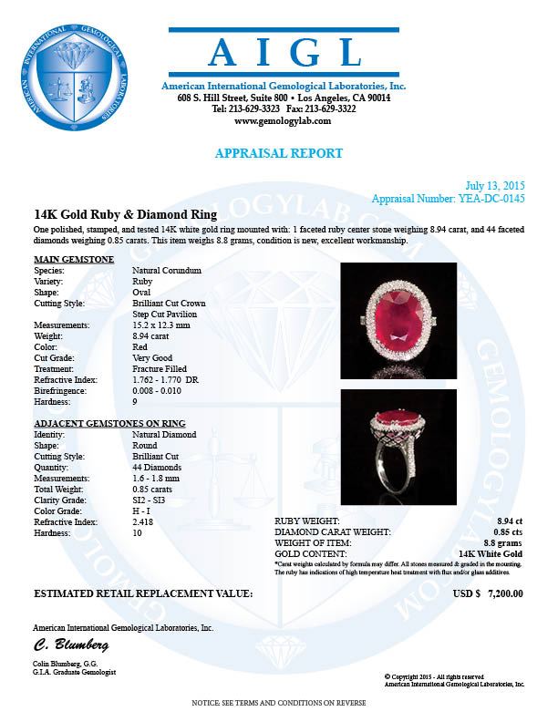 Retail: $7,200.00****** 14K Gold Ruby & Diamond Ring ****** Metal: 14K Solid White Gold / Total Item Weight: 8.8 grams / Country Made: United States / / Main Stone: Ruby / Color: Red / Carat Total Weight: 8.94 / Treatment: None / Clarity: Type 2 / Cut: Very Good / / Secondary Stone: Diamond / Carat Total Weight: 0.85 / Treatment: None / Color Grade : H - I / Clarity: SI1 - SI3/ Cut: Round Brilliant /