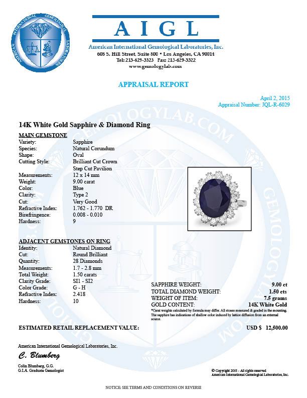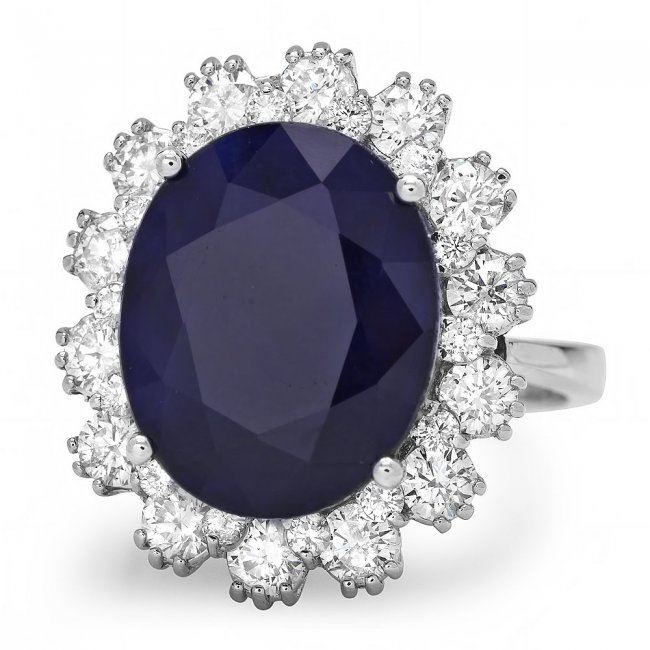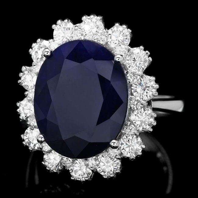 Retail: $12,460.00 ****** 14k Gold 9.00ct Sapphire 1.50ct Diamond Ring ****** Metal: 14k Solid White Gold / Size: 7 / Total Item Weight: 7.5 grams / Country Made: United States / / Main Stone: Sapphire / Color: Blue / Carat Total Weight: 9.00 / Treatment: Heating / Clarity: Type 2 / Cut: Very Good / / Secondary Stone: Diamond / Carat Total Weight: 1.50 / Treatment: None / Color Grade: G - H / Clarity: SI1 - SI2 / Cut: Very Good /