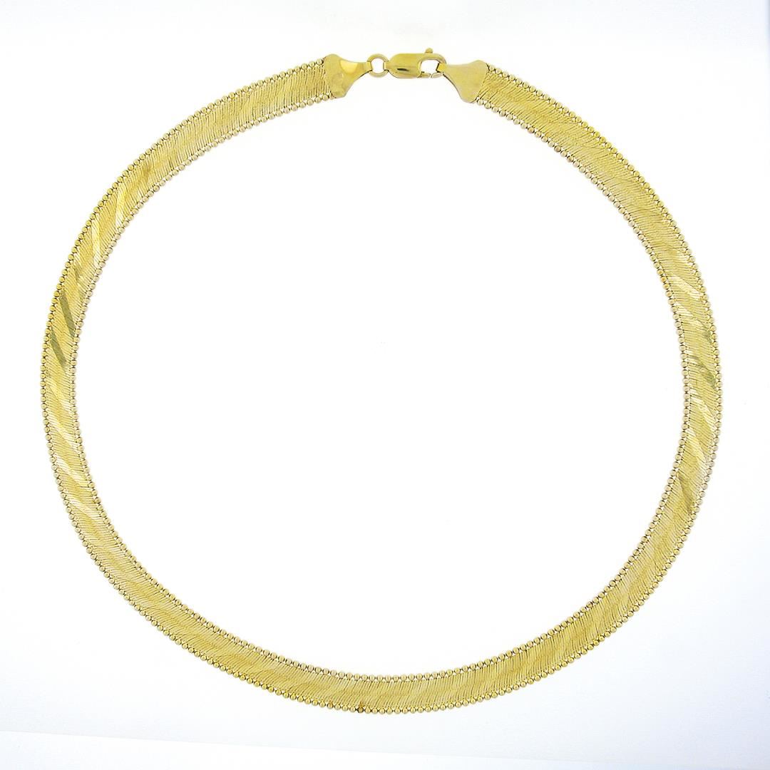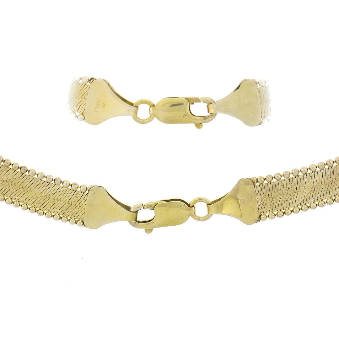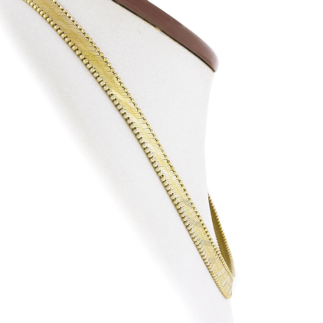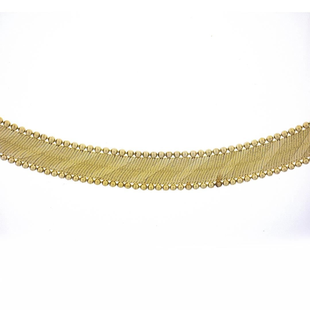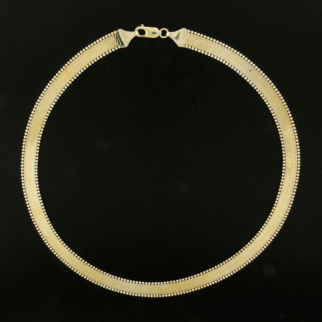 A solid 14k yellow gold flat & beaded link necklace. It weighs a total of 18.83 grams, measures 9.1mm wide, and measures 17 inches in length.