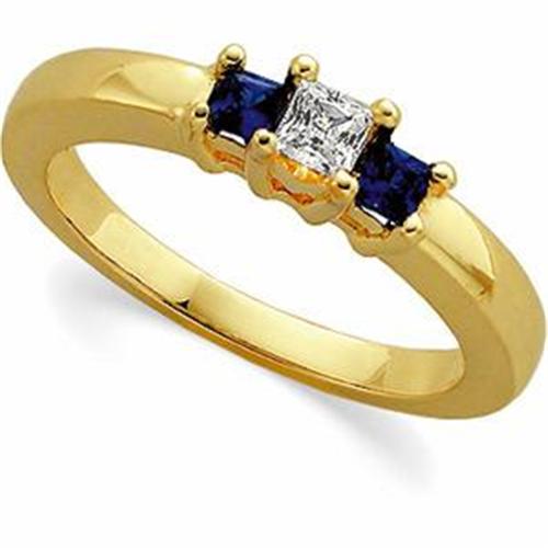 This 3 Stone Anniversary Ring is 14k Yellow Gold. It features a center PRINCESS CUT DIAMOND = .18 CARATS with a Princess Cut SAPPHIRE set each side. This pair of FINE CEYLON SAPPHIRES = .25 CARATS! This elegant 14k Gold Wedding Band is a Size 6 but I can resize it for you either larger or smaller and it IS in 'Brand New' condition!