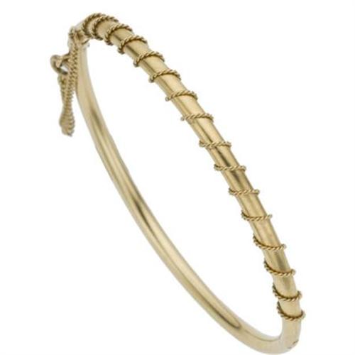 <B>Gold Bangle Bracelet</B></I><BR><BR>The 14k yellow gold hinged bangle is enhanced by a twisted wire wrapping, completed by a safety chain. Gross weight 5.90 grams. <BR><I>Length: 7 inches</B></I> <B>Condition Report:</B> Good condition.<BR><BR><b>Shipping:</b> Miscellaneous Collectibles, Smal (<a target="_blank" href="http://www.heritageauctions.com/common/shipping.php">view shipping information</a>)