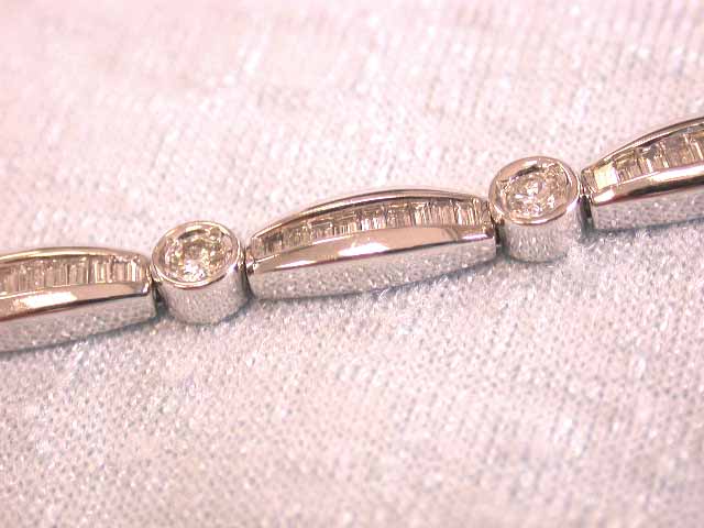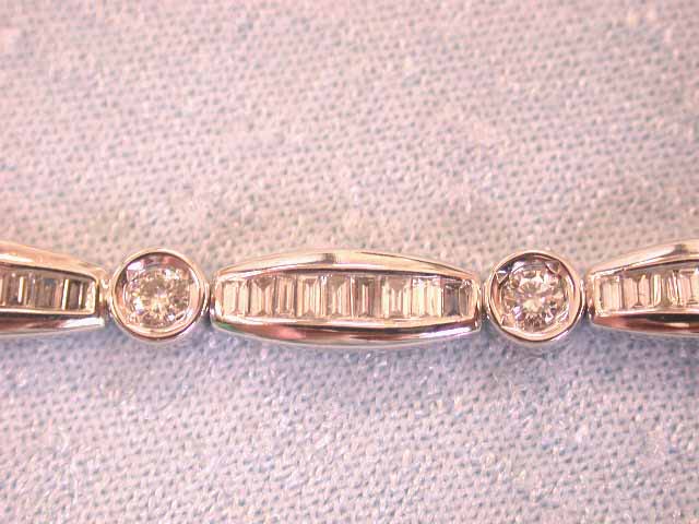 14k Gold Bracelet w/ Round Cut Diamonds - 0.60 carat, G color and VS clarity and Baguettes Cut Diamonds - 1.41 carats, G color and VS clarity. The length is approximately 7 inches long and weighs 11.84 grams