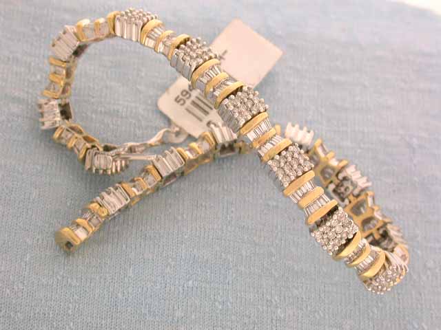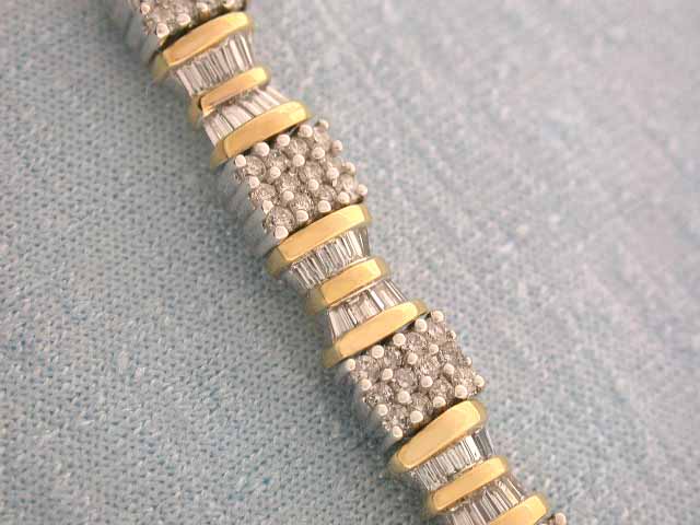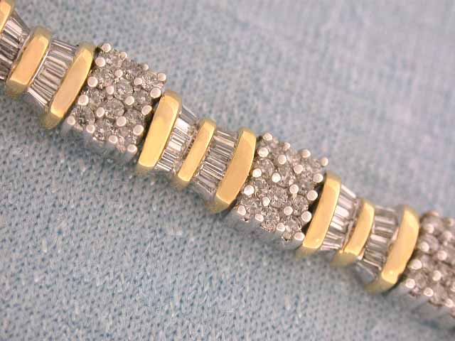 14k Gold Bracelet w/ Baguettes Cut Diamonds - 2.50 carats, G color and VS clarity and Round Cut Diamonds - 2.00 carats, G color and VS clarity. The length is approximately 7 inches long and weighs 21.74 grams