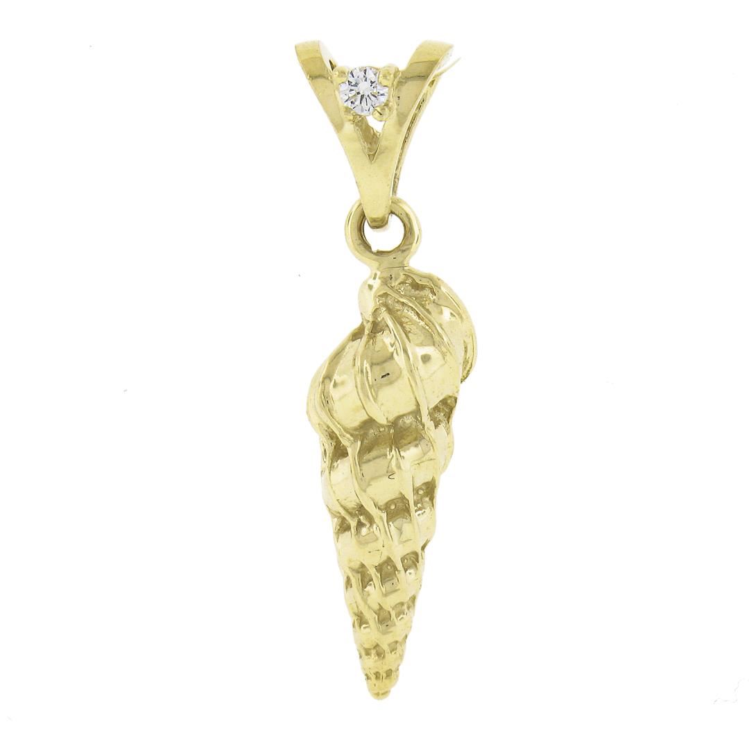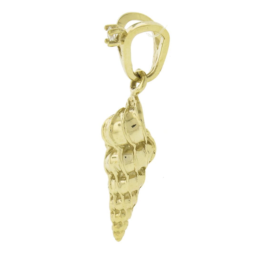 14k Gold Detailed Textured 3D Shell Charm Pendant w/ 0.04ct Diamond on Bail