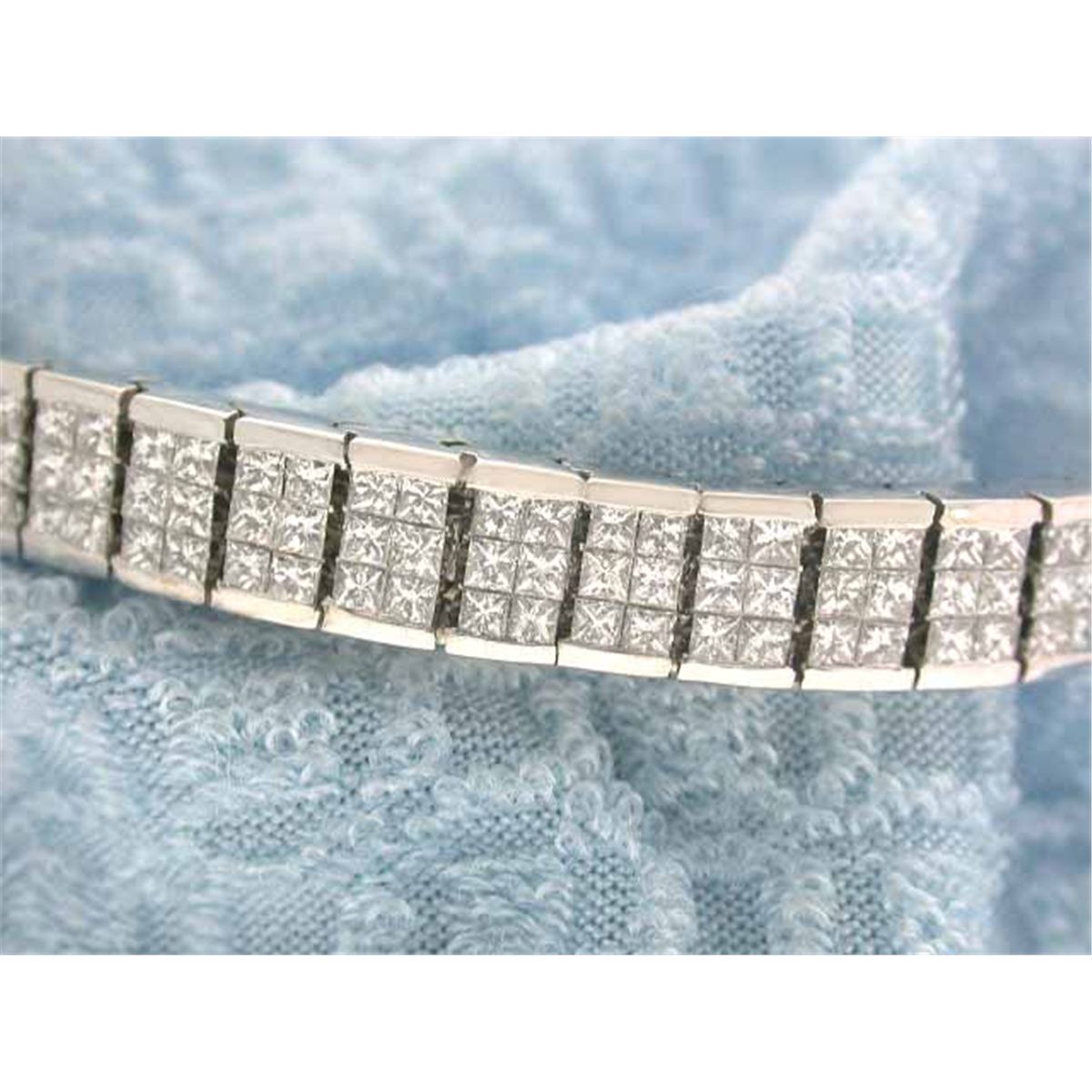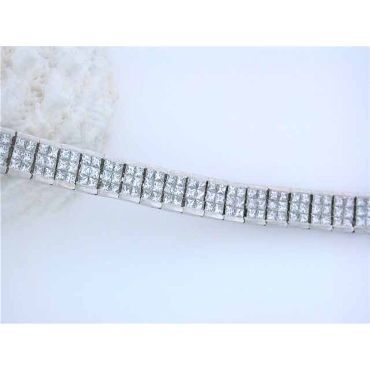 14k White Gold Bracelet. The bracelet has Diamonds - 7.60 carats, 291 pieces, princess cut. Its Length - approximately 7 inches long; Width - approximately 6.5 mm; and Weight - 29.92 grams.