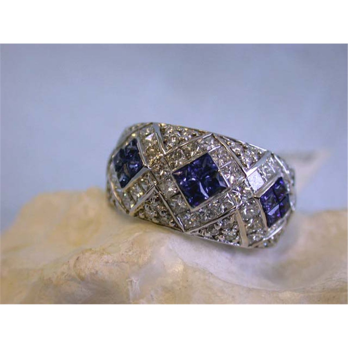 14k Gold Ring w/ Diamonds & Sapphires. This is an 14k Gold Ring w/ 2.18 carats Princess Cut Diamonds in G color and VS clarity and 0.28 carat Round Diamonds in G color and VS clarity and 0.70 carat Sapphire. The ring size of this is 6.5 and weighs 9.96 grams.