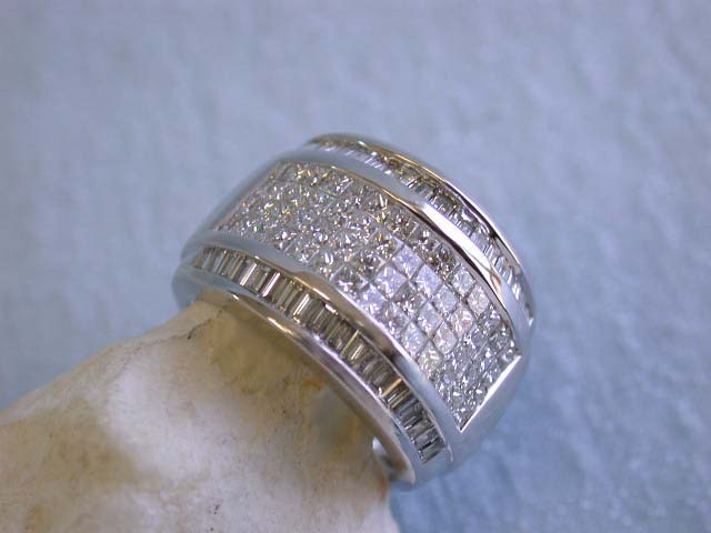 14k Gold Ring w/ Diamonds. This is a 14k Gold Ring w/ 1.72 carats Princess Cut Diamonds in G color and VS clarity and 0.78 carat Baguettes Cut Diamonds in G color and VS clarity. The size of this is 6.75 and weighs 13.26 grams.