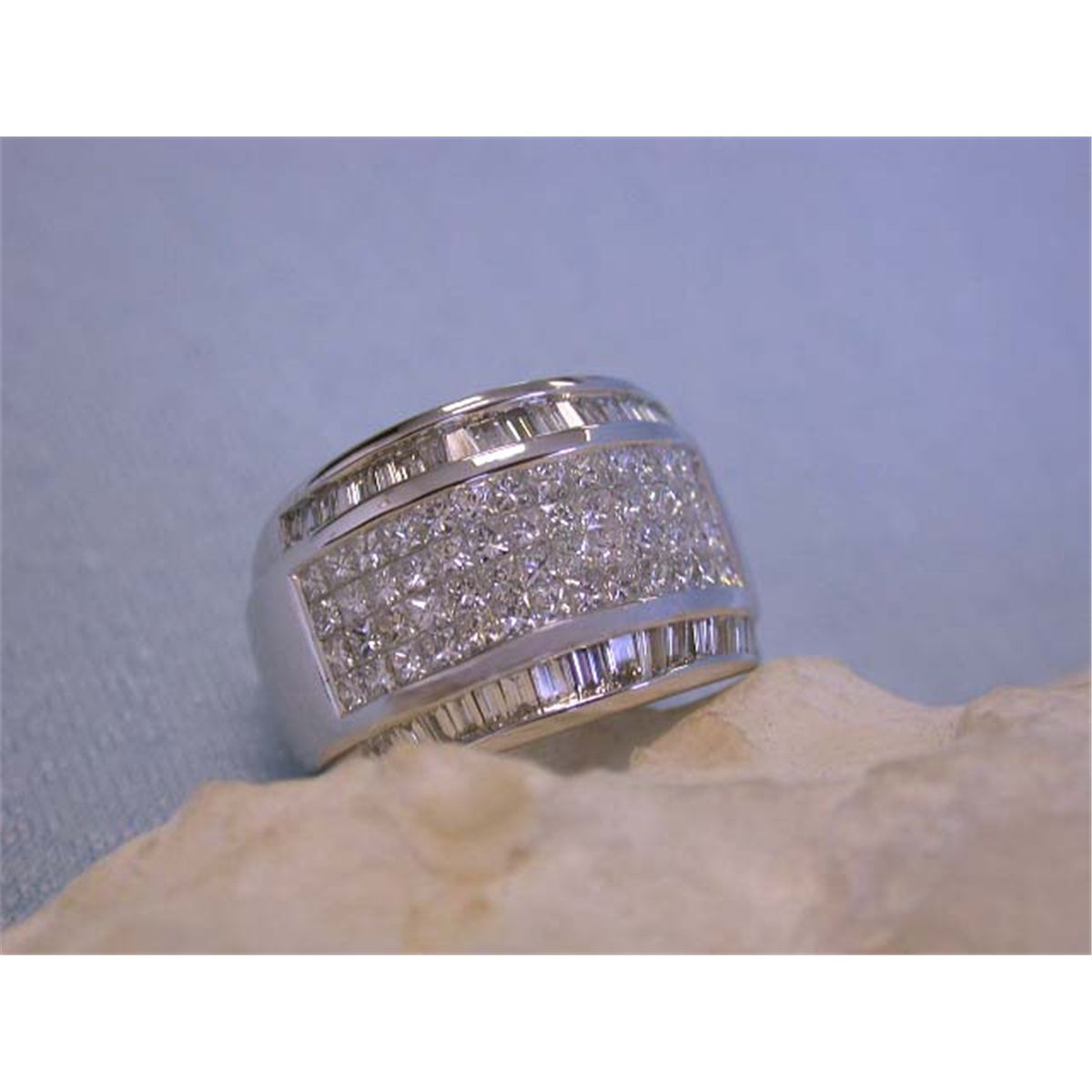 14k Gold Ring w/ Diamonds. This is a 14k Gold Ring w/ 1.72 carats Princess Cut Diamonds in G color and VS clarity and 0.78 carat Baguettes Cut Diamonds in G color and VS clarity. The size of this is 6.75 and weighs 13.26 grams.