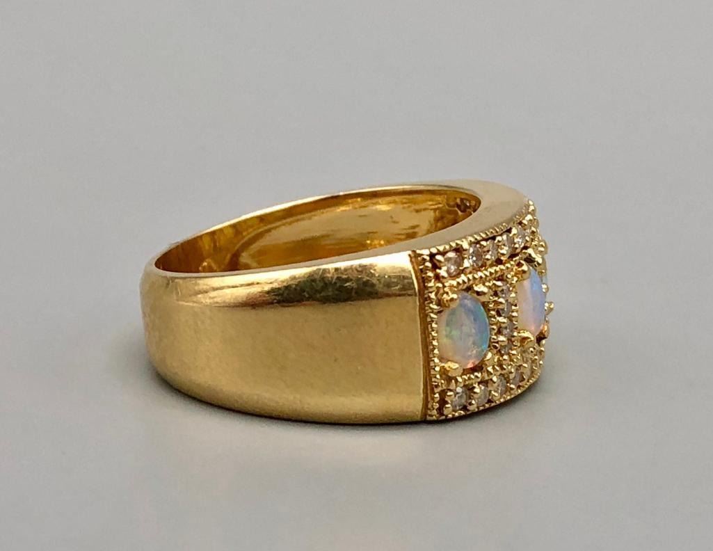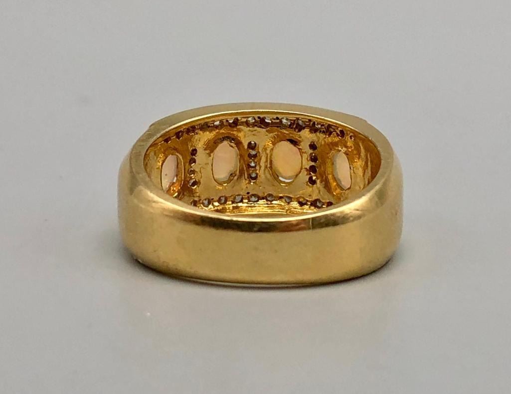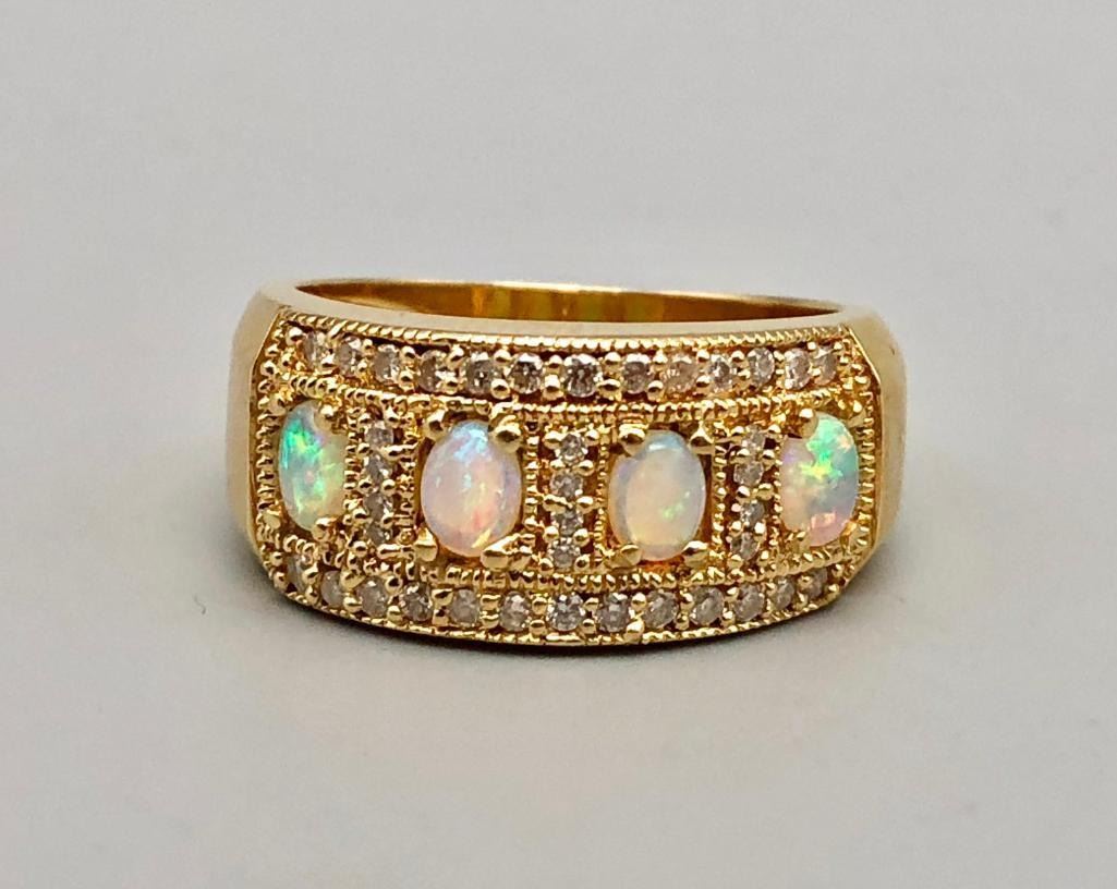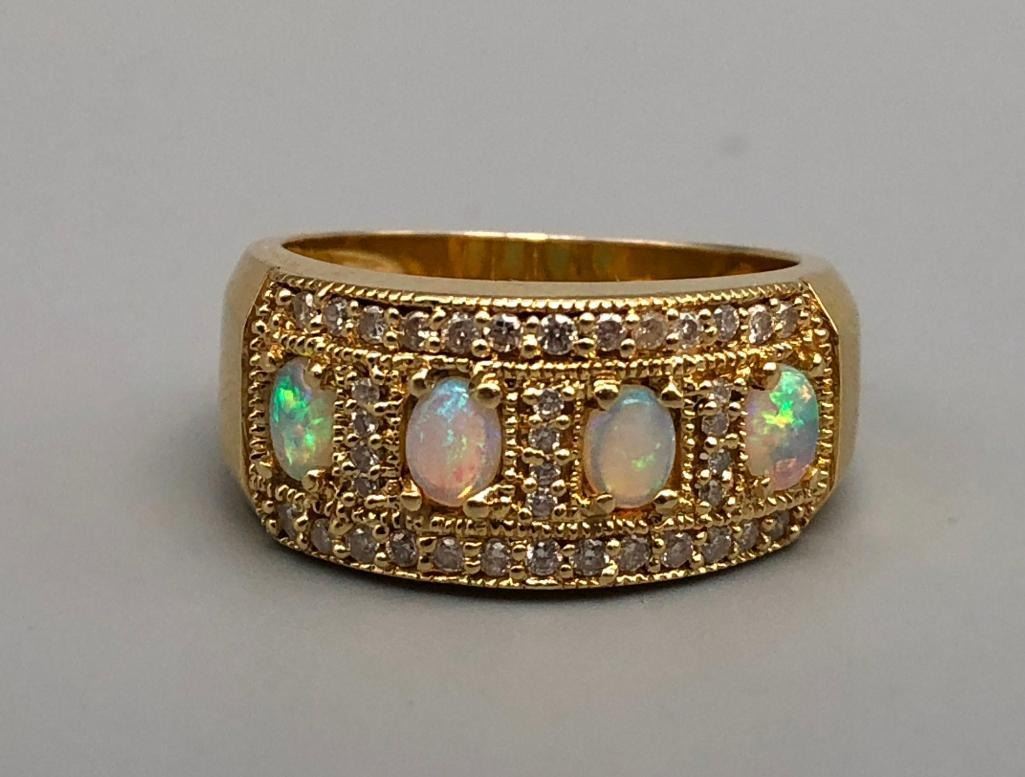Up for consideration is this 14k gold, diamond and opal estate ring. This is a lovely wide band ring, set with four opal cabochons which are accented with 1/2ct of diamonds. It is stamped as 14k. MAKER: Unmarked. APPROX AGE: Fairly modern. SIZE: Fits a size 7. 3/8 inch wide band. Weighs 8.9 grams. CONDITION: Good for its age, normal wear expected. Please look closely at the pictures as they are an important part of our description and are hereby incorporated into the description, specifically with regards to condition. SHIPPING: There will be a $5 handling / packaging fee for shipping this lot. The actual cost of postage will be added on top of that. BUY IT NOW: If you would like to buy this item now, without waiting for the auction day to bid on it, we do offer this option (which is available up to 48 hours before the actual auction starts). The “Buy it Now†price is the high estimate of this lot (plus applicable fees and the Buyer's premium is discounted to 10% when using the Buy it Now option). If you would like to exercise this option, you must contact us by email (or phone as long as you talk to someone live). Reference this lot number and your intention to "Buy it Now."