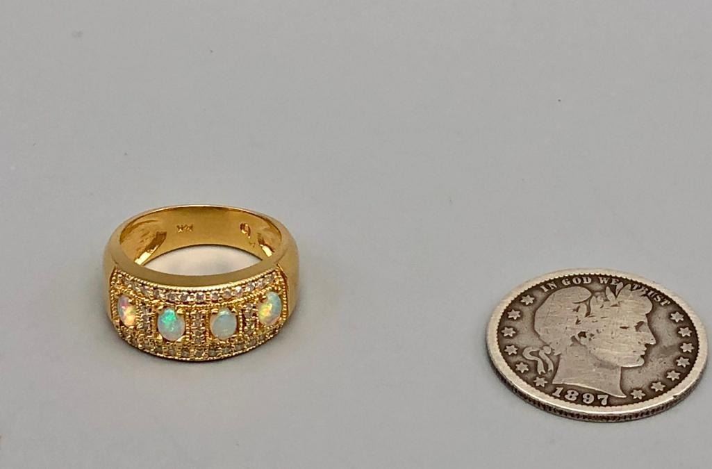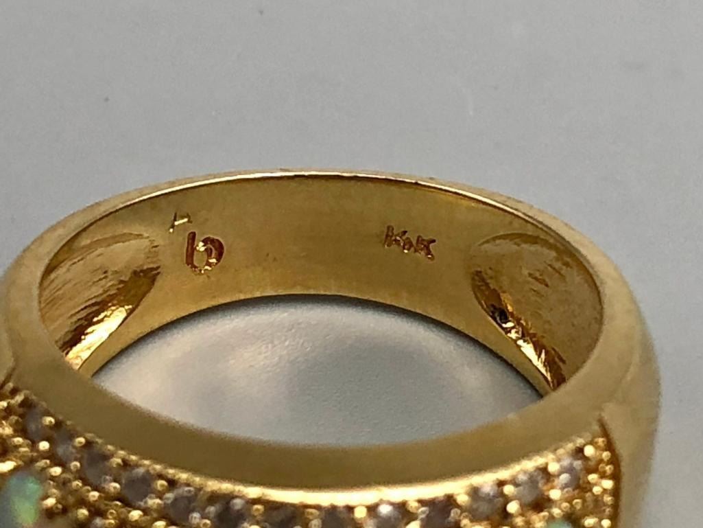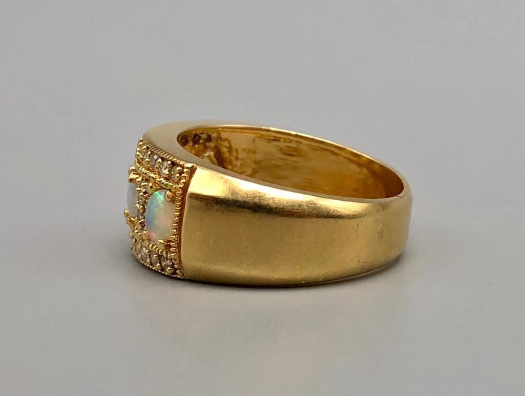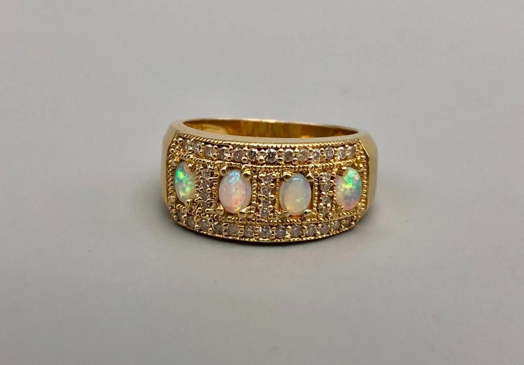 Up for consideration is this 14k gold, diamond and opal estate ring. This is a lovely wide band ring, set with four opal cabochons which are accented with 1/2ct of diamonds. It is stamped as 14k. MAKER: Unmarked. APPROX AGE: Fairly modern. SIZE: Fits a size 7. 3/8 inch wide band. Weighs 8.9 grams. CONDITION: Good for its age, normal wear expected. Please look closely at the pictures as they are an important part of our description and are hereby incorporated into the description, specifically with regards to condition. SHIPPING: There will be a $5 handling / packaging fee for shipping this lot. The actual cost of postage will be added on top of that. BUY IT NOW: If you would like to buy this item now, without waiting for the auction day to bid on it, we do offer this option (which is available up to 48 hours before the actual auction starts). The “Buy it Now†price is the high estimate of this lot (plus applicable fees and the Buyer's premium is discounted to 10% when using the Buy it Now option). If you would like to exercise this option, you must contact us by email (or phone as long as you talk to someone live). Reference this lot number and your intention to "Buy it Now."