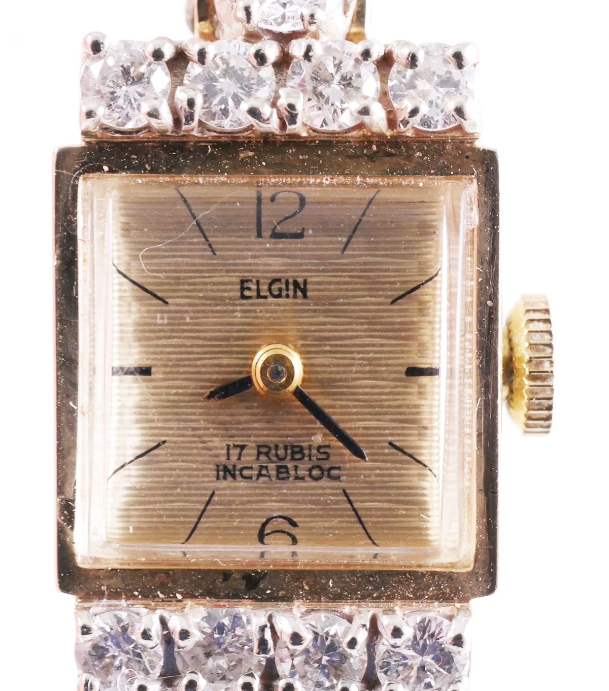 Vintage ladies wristwatch (Elgin, with replacement quartz movement), 14k yellow gold case and bracelet set with about 3 carats of diamonds. Total weight 14.4 grams not including movement.