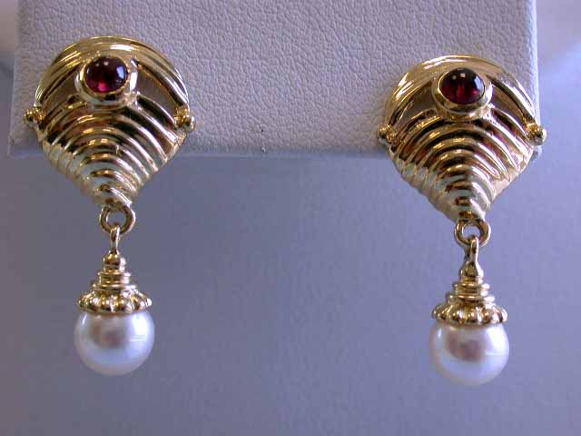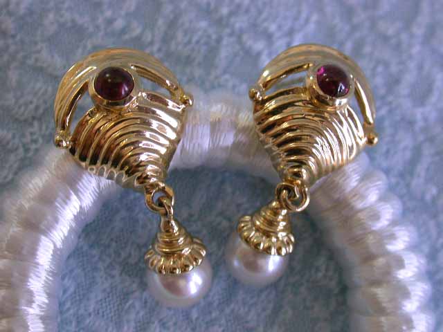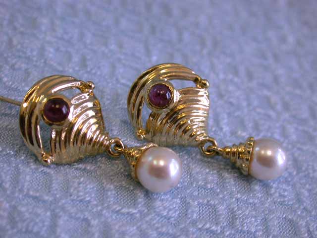 14k Yellow Gold Earrings with Pearl - 7.3 mm and Ruby approximately 1.25 inches long and weighs 7.40 grams