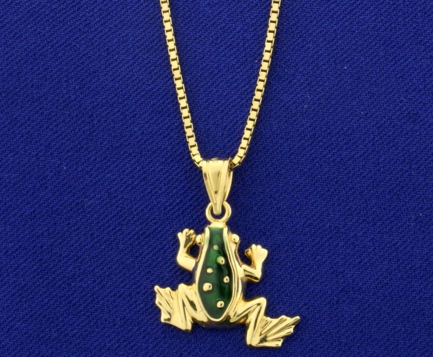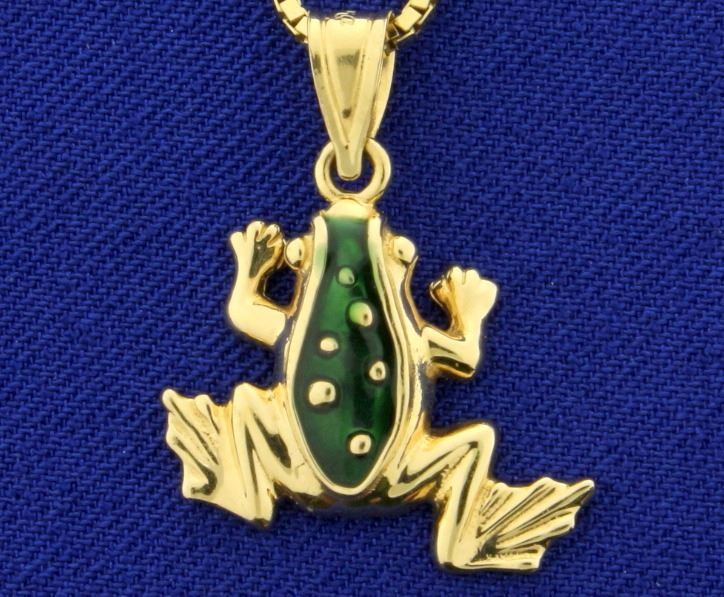 In 14k yellow gold. Gold frog with green enamel. 18" long chain with lobster clasp and 1" long pendant with bale.6.5g.