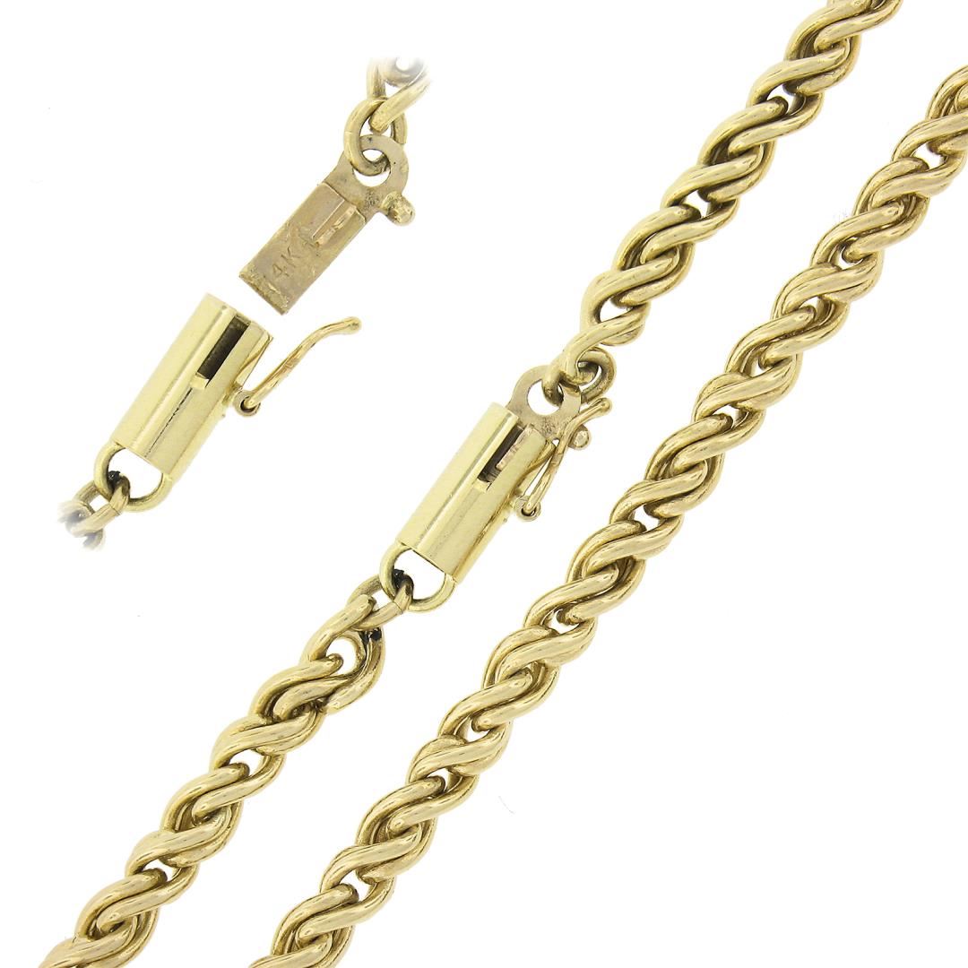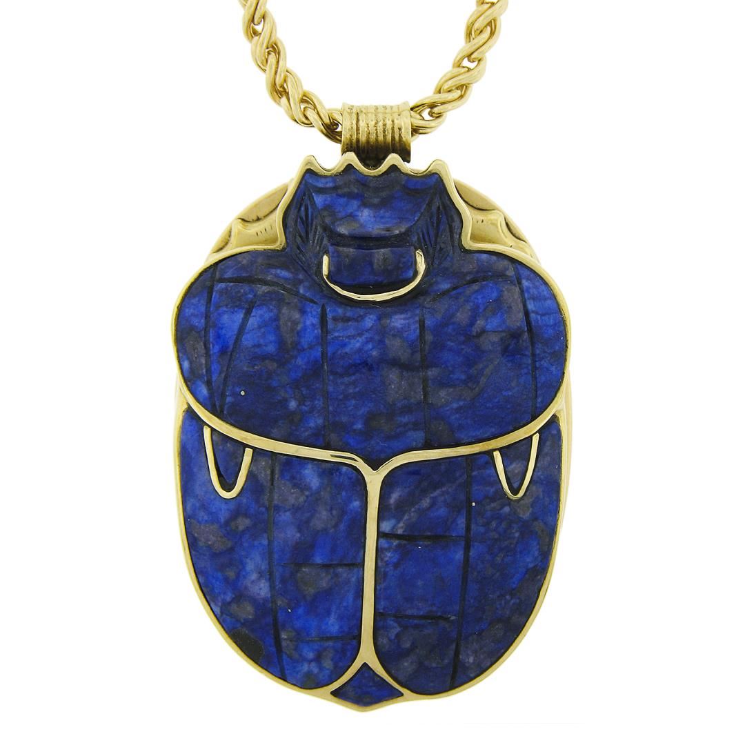 A solid 14k yellow gold pendant necklace, with carved natural lapis . 18 inch rope link chain, 153.09 grams total weight, pendant measures 60.9x40.3mm.