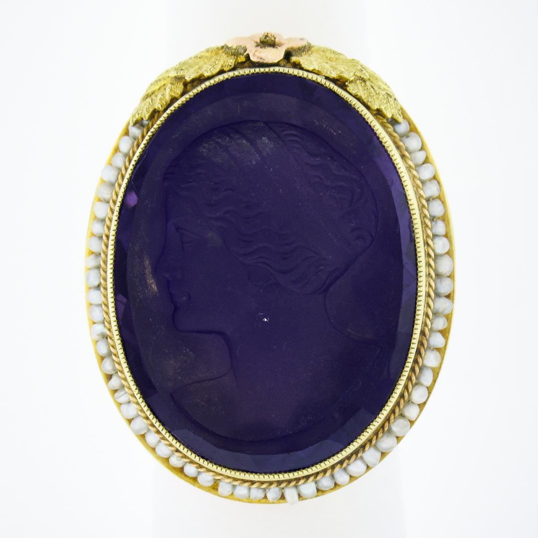 A solid 14k yellow gold floral ring. with 1 carved cameo oval cut natural amethyst ( 20x26.5x9.5mm (approx.) - 26ct ), and a halo of numerous semi round cultured seed pearls. The ring is size 6.0, weighs a total of 14.02 grams, and measures 31.8mm wide.