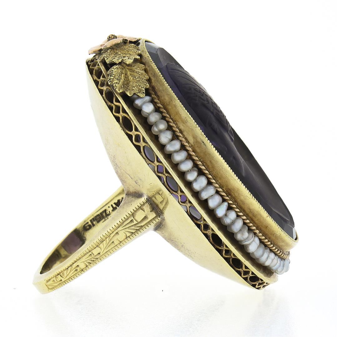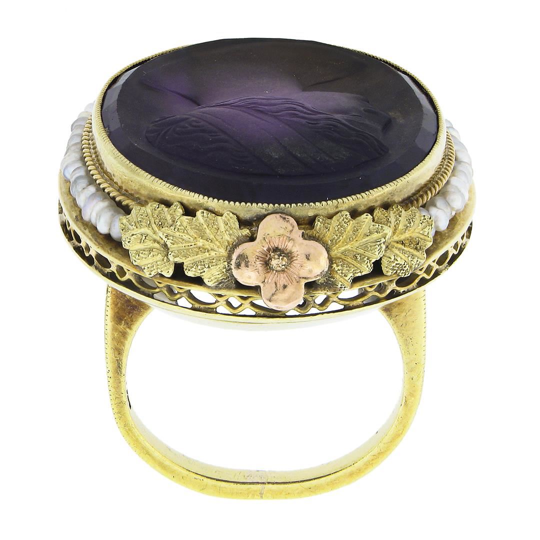 A solid 14k yellow gold floral ring. with 1 carved cameo oval cut natural amethyst ( 20x26.5x9.5mm (approx.) - 26ct ), and a halo of numerous semi round cultured seed pearls. The ring is size 6.0, weighs a total of 14.02 grams, and measures 31.8mm wide.