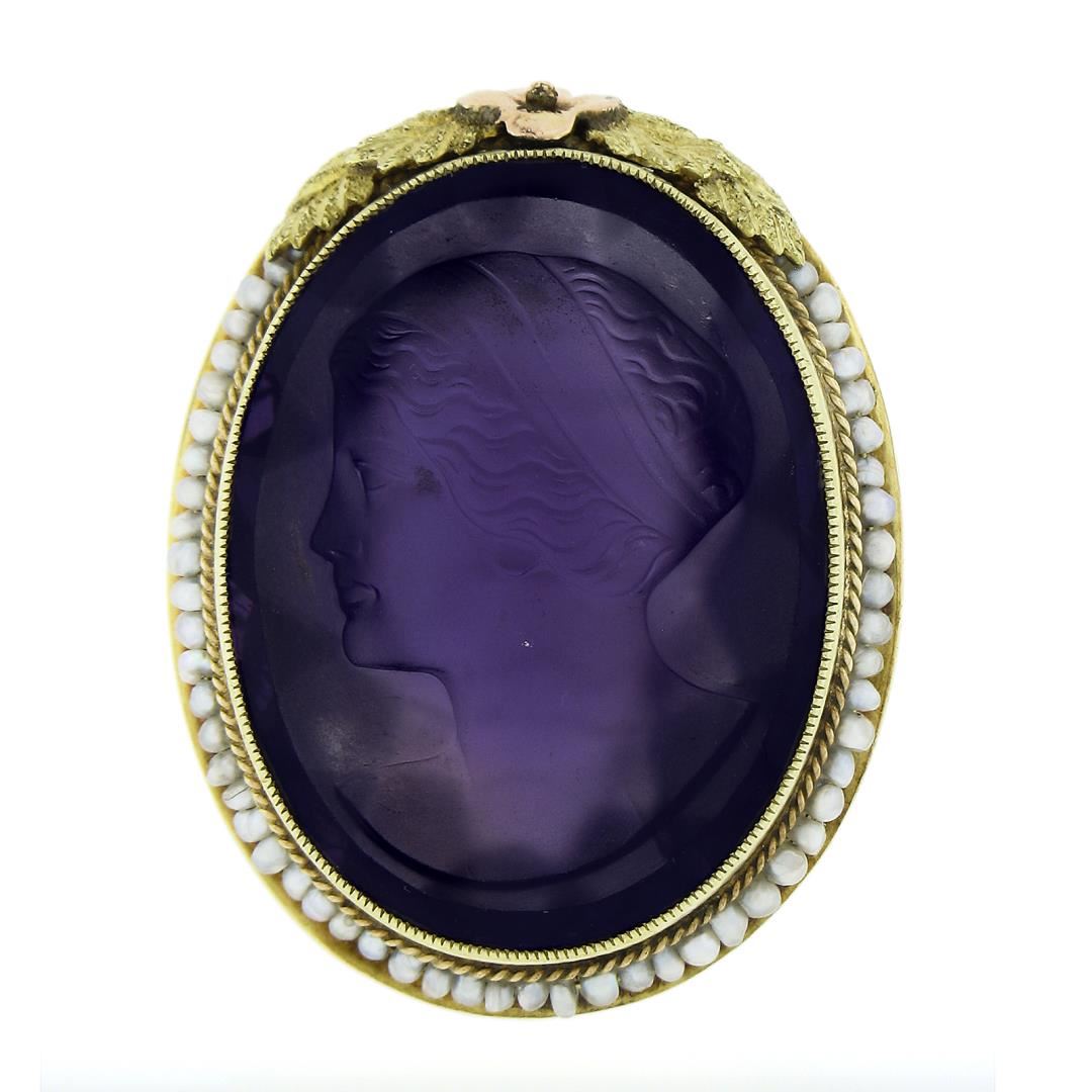 A solid 14k yellow gold floral ring. with 1 carved cameo oval cut natural amethyst ( 20x26.5x9.5mm (approx.) - 26ct ), and a halo of numerous semi round cultured seed pearls. The ring is size 6.0, weighs a total of 14.02 grams, and measures 31.8mm wide.