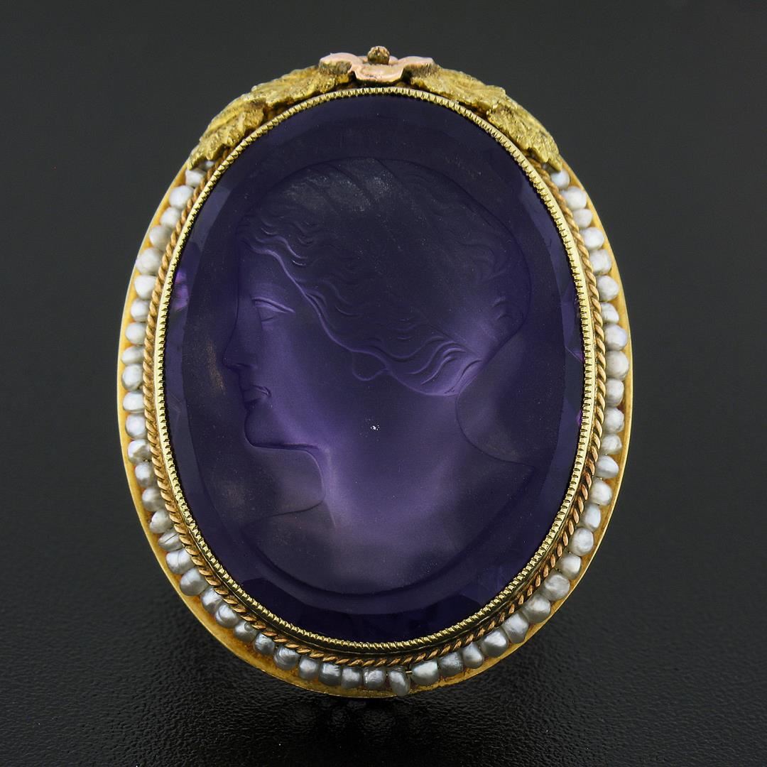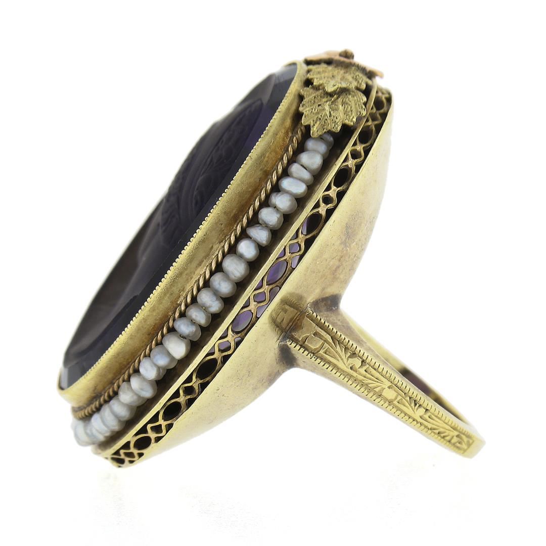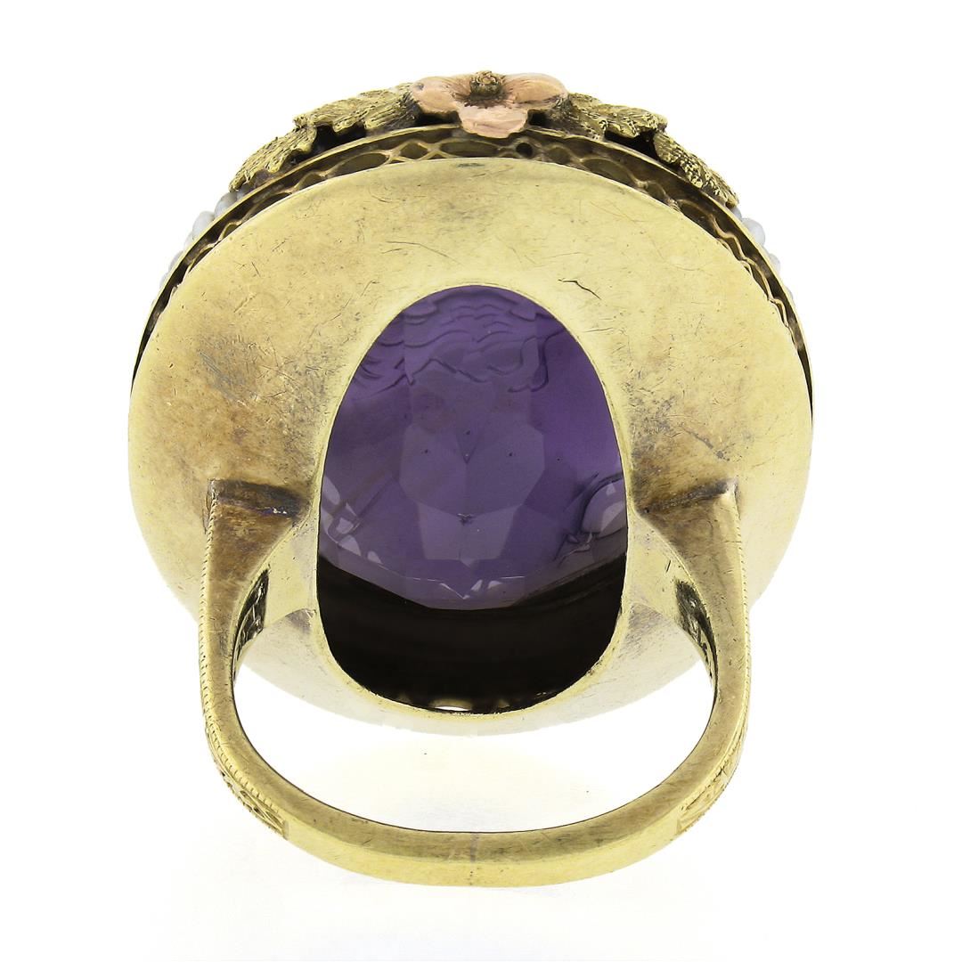 14k Gold Left Facing Amethyst Cameo Ring w/ Seed Pearl Filigree & Floral Frame