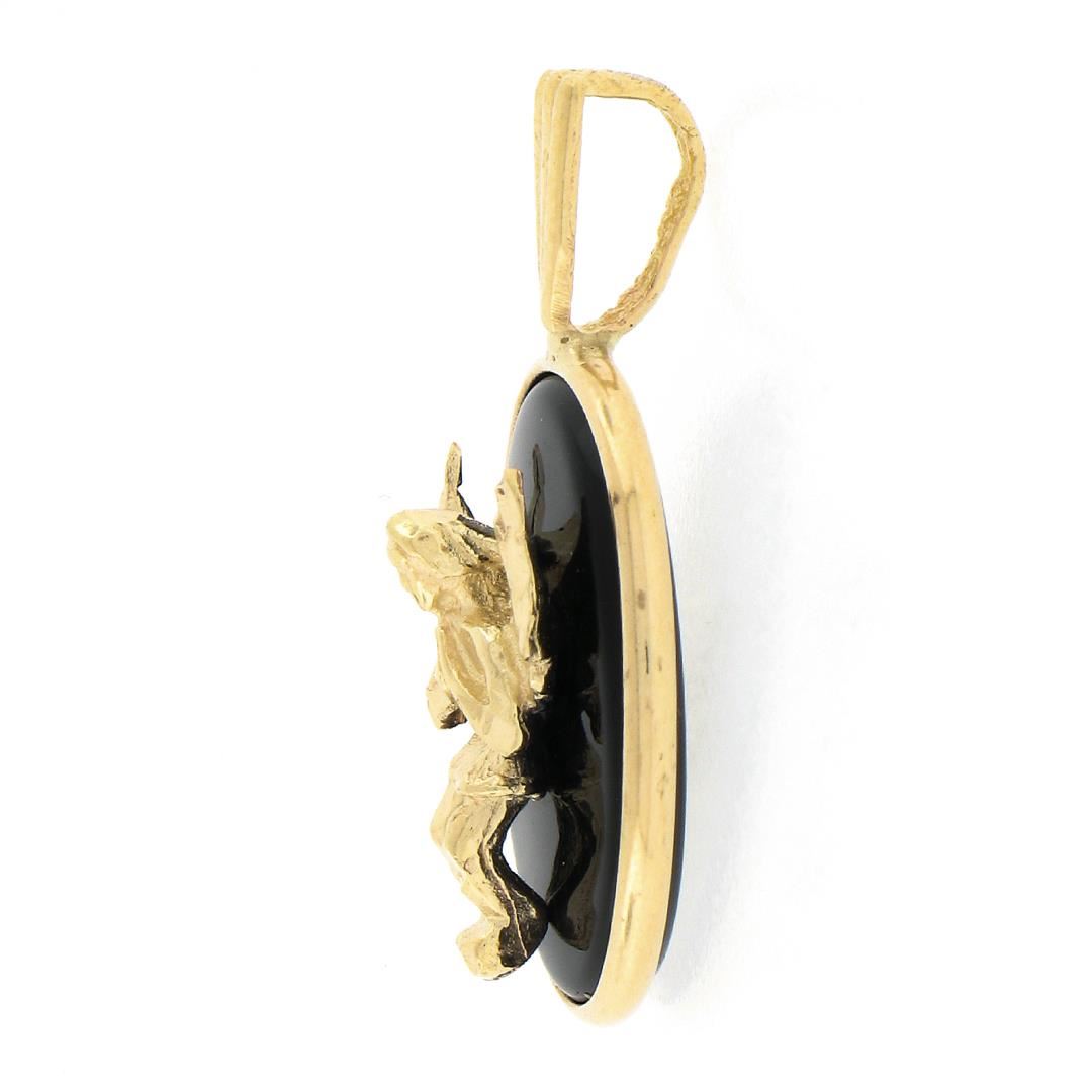 A solid 14k yellow gold pendant, with 1 oval cut natural black onyx (15.7x11.8mm). The pendant weighs a total of 2.06 grams, measures 23.80x12.90mm including the bail, and the inside of the bail measures 5.2x2.9mm.