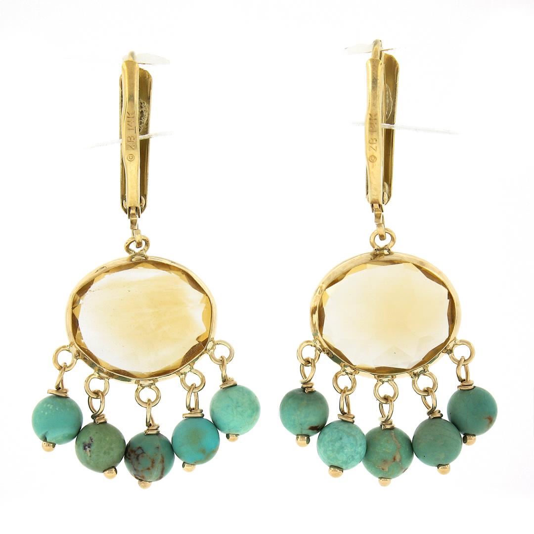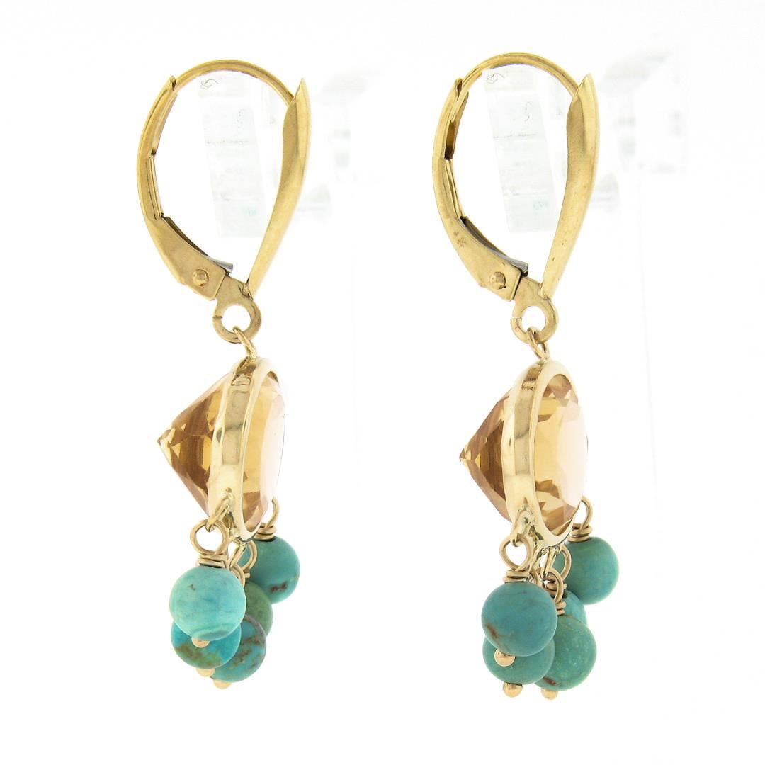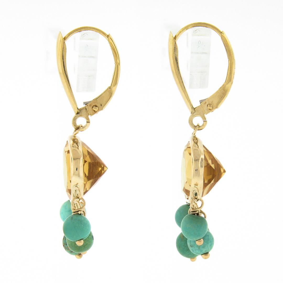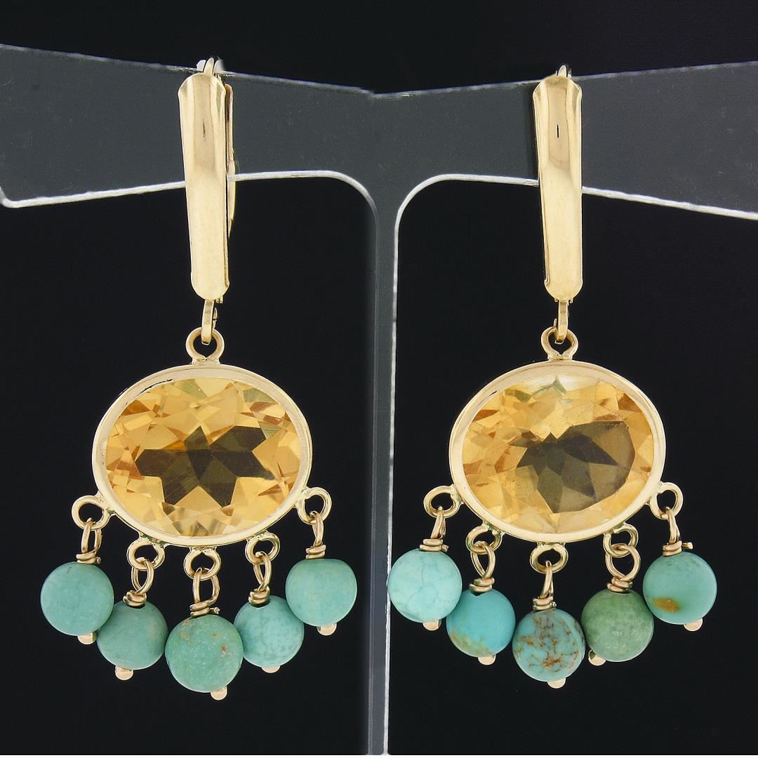 A solid 14k yellow gold dangle earrings, with 10 round shape natural turquoises (4.0mm to 4.4mm each ), and 2 oval cut natural citrines (11x9.1mm). The earrings measure approximately 36x18.30mm and weigh a total of 4.0 grams.