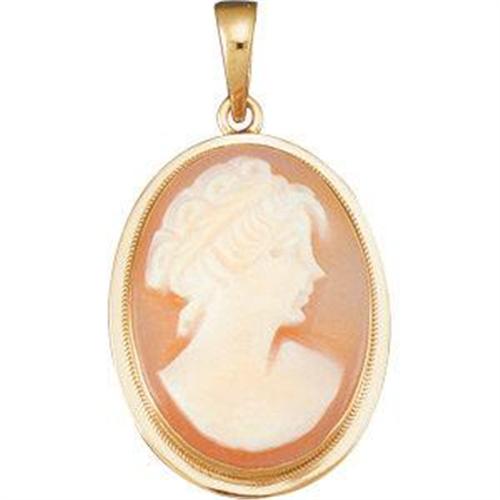 This 14k Yellow Gold Pendant features an Oval Carnelian SHELL CAMEO of a lovely WOMAN looking to her left. The Cameo is framed in 14k Yellow Gold and it measures almost one inch x three quarters of an inch. There is a 14k Yellow Gold bail to slip your chain thru.