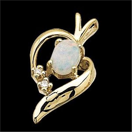 14k Yellow Gold Pendant featuring a Genuine Oval Cabachon Opal with 2 Diamonds as accent set in lovely swirl goldwork. The Opal Total Weight = .50 cts.