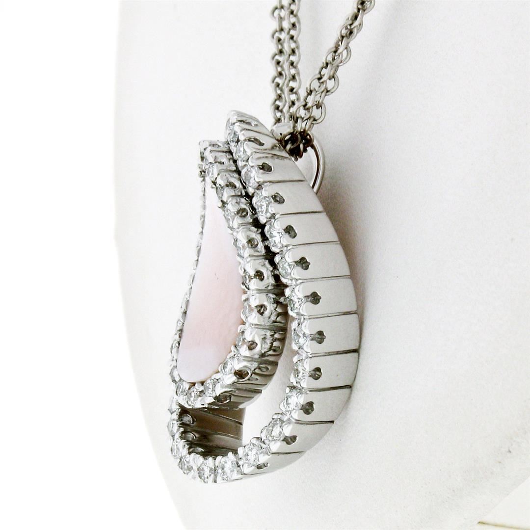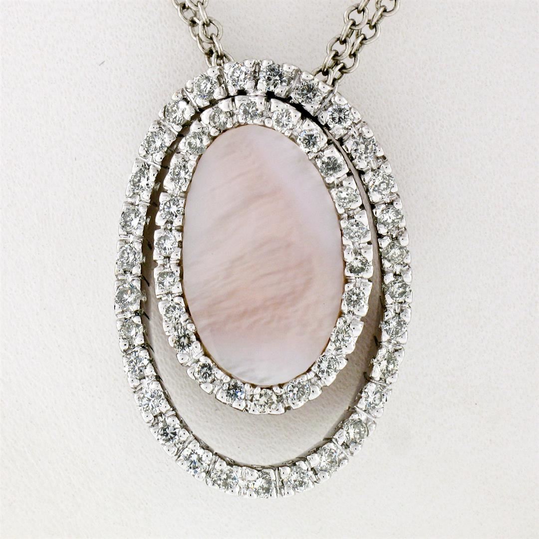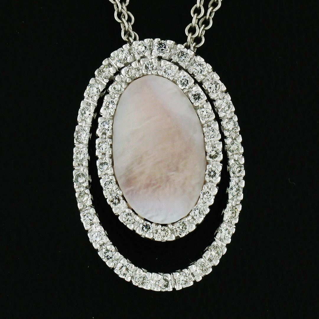 An estate solid 14k white gold slide pendant necklace, with 1 custom concave cut natural mother of pearl (16.3x10.1mm), surrounded with 51 round brilliant cut natural diamonds (G/H - VS2/SI1; 1.12ctw). The pendant weighs a total of 14.05 grams, measures 27.8x19.15mm including the bail, and 16 inch dual cable link chain