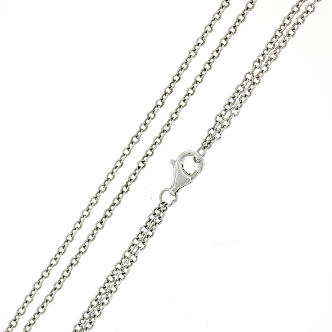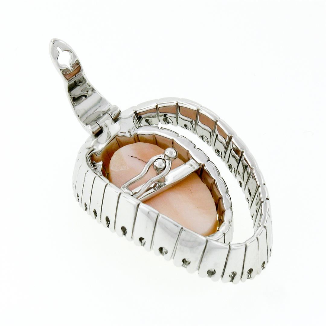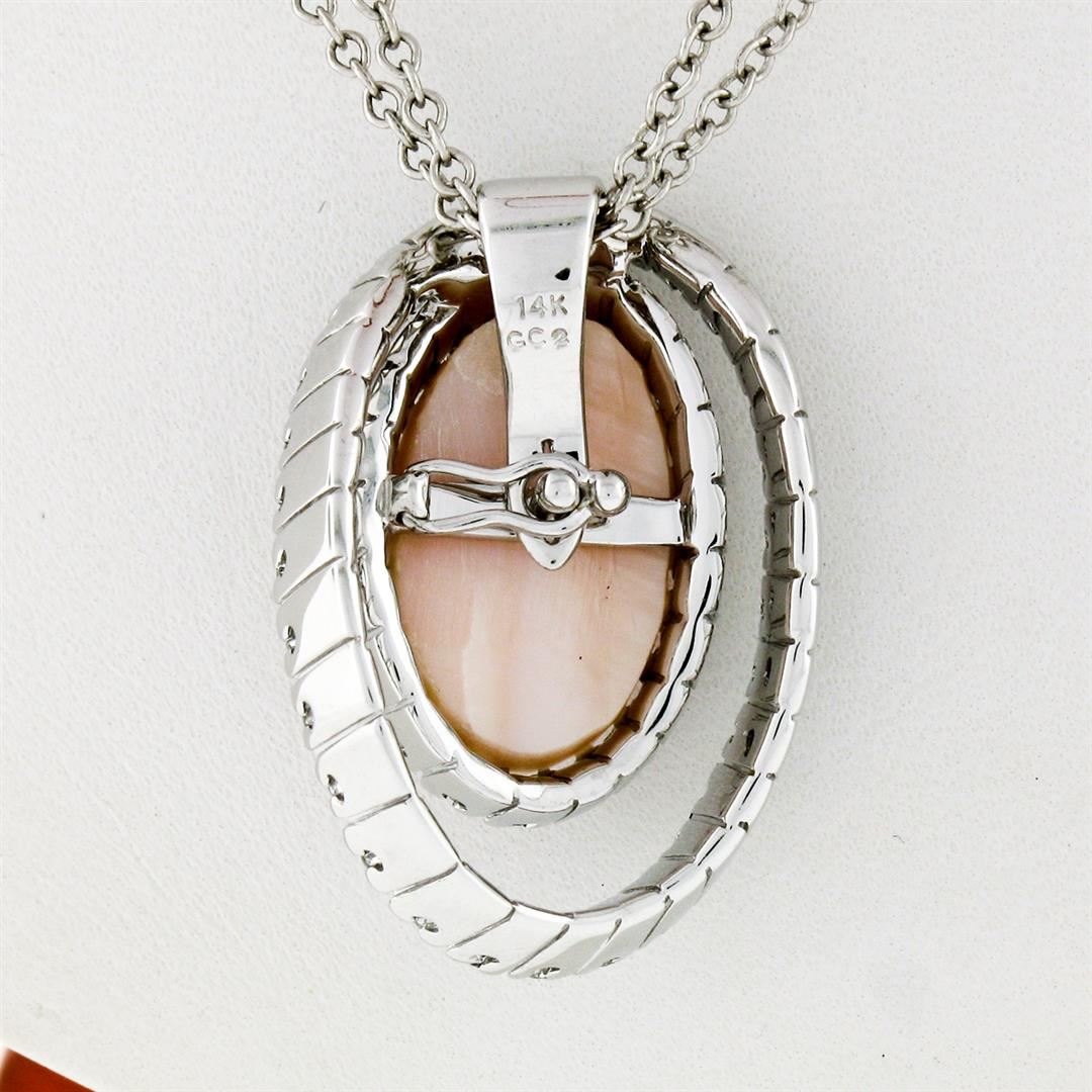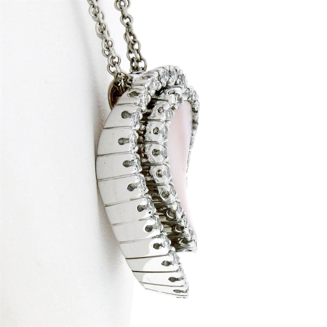 An estate solid 14k white gold slide pendant necklace, with 1 custom concave cut natural mother of pearl (16.3x10.1mm), surrounded with 51 round brilliant cut natural diamonds (G/H - VS2/SI1; 1.12ctw). The pendant weighs a total of 14.05 grams, measures 27.8x19.15mm including the bail, and 16 inch dual cable link chain