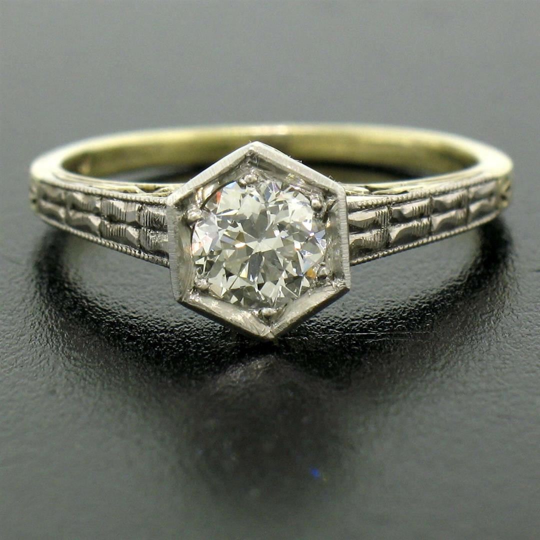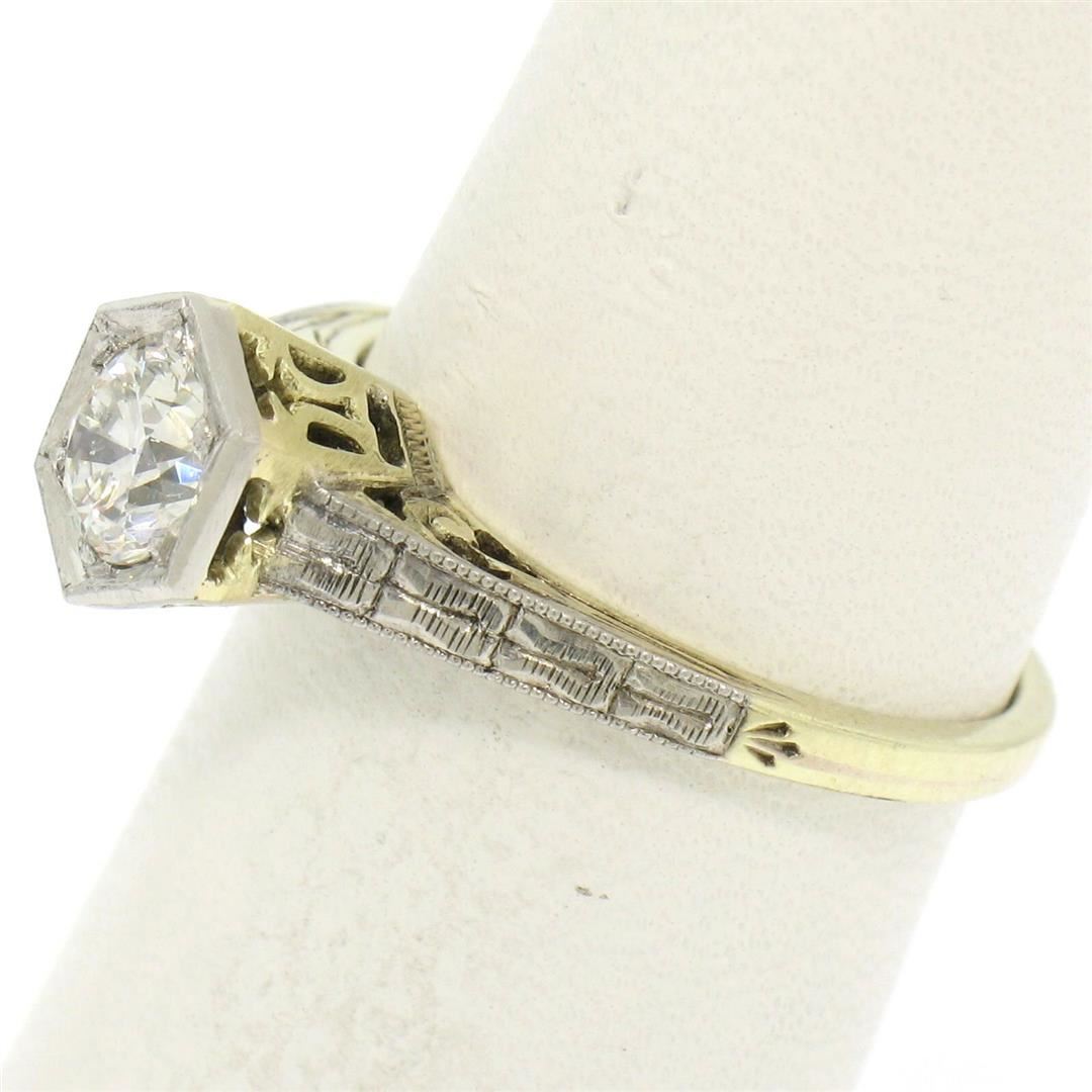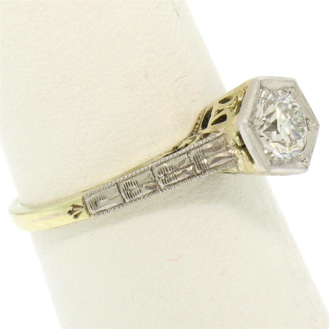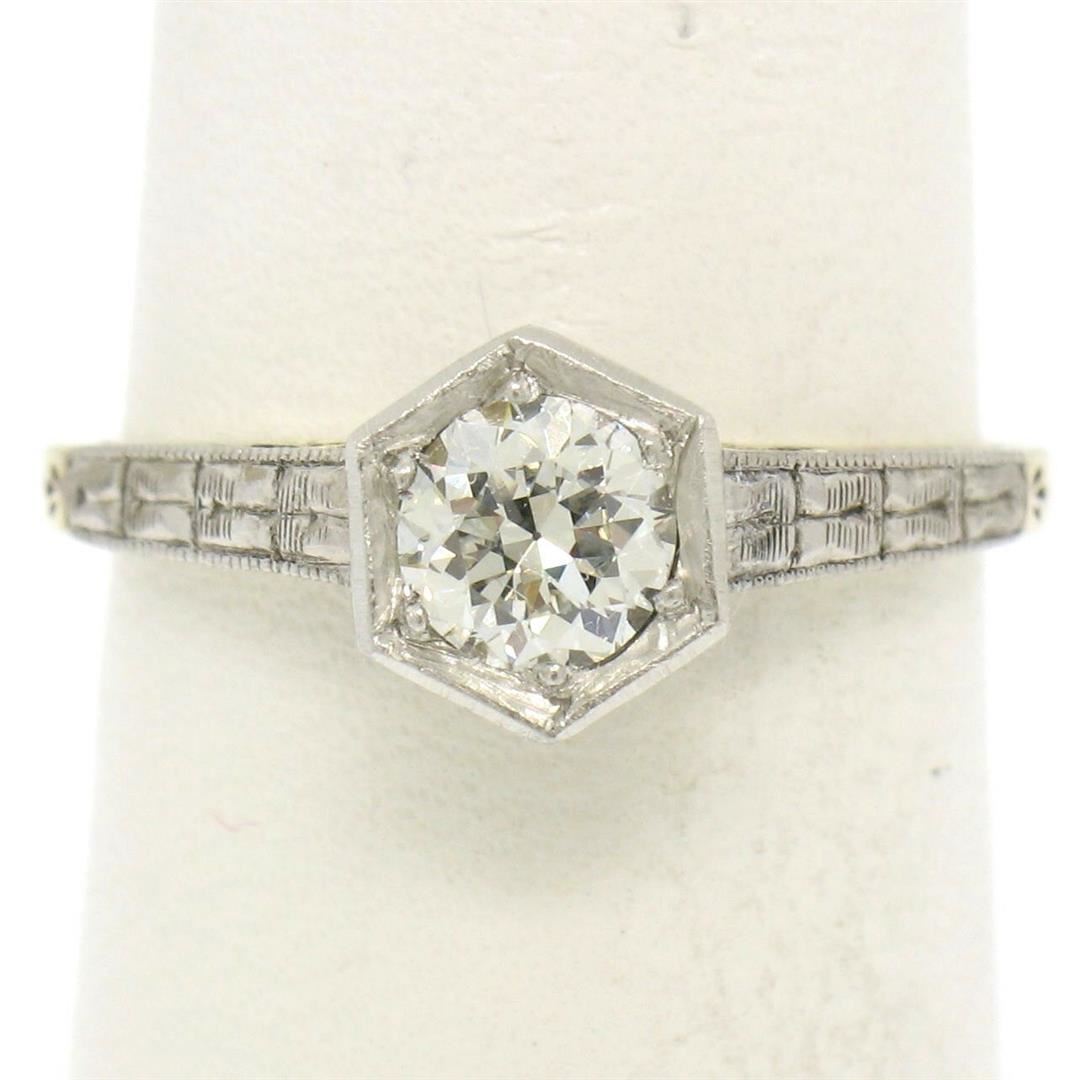One Antique Art Deco 14k Gold & Platinum European Diamond Solitaire Engagement Ring. Item Details: Material: Solid 14k Yellow Gold w/ Platinum Top, Weight: 3.0 Grams, Stone(s): (1) Natural Genuine Diamond - Old European Cut - Bead Prong Set - E/F Color - VVS2/VS1 Clarity, Total Carat Weight: 0.50 (approx.), Ring Size: 6.0 (We can custom size this ring.), Ring Width: 7.54mm, Ring Height: 7.62mm rise off the finger, Condition: Excellent, ready to wear condition!