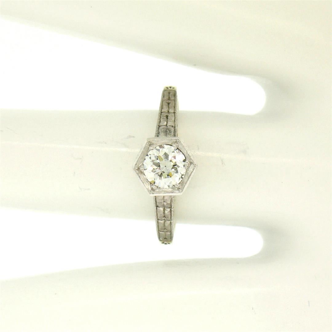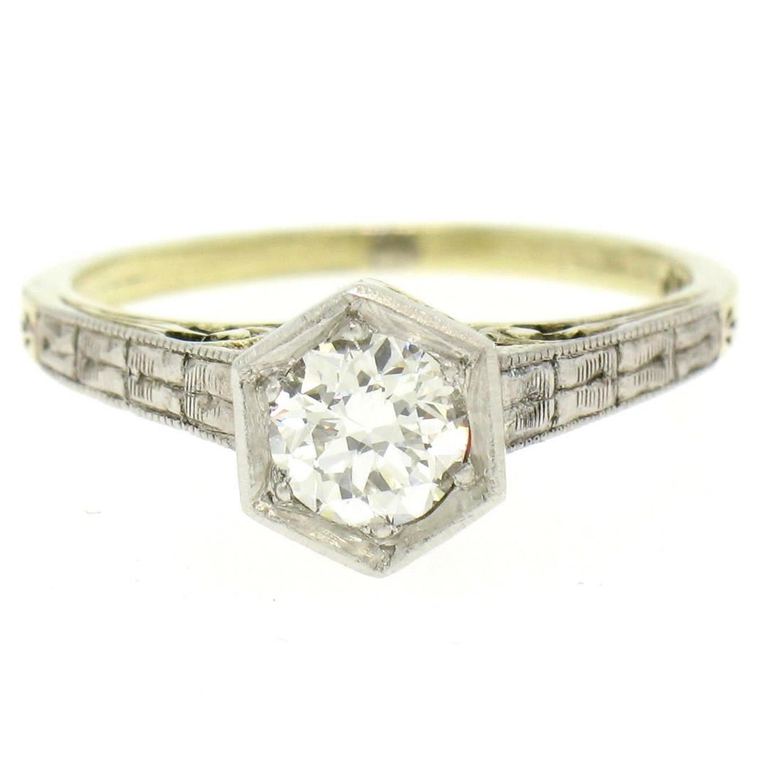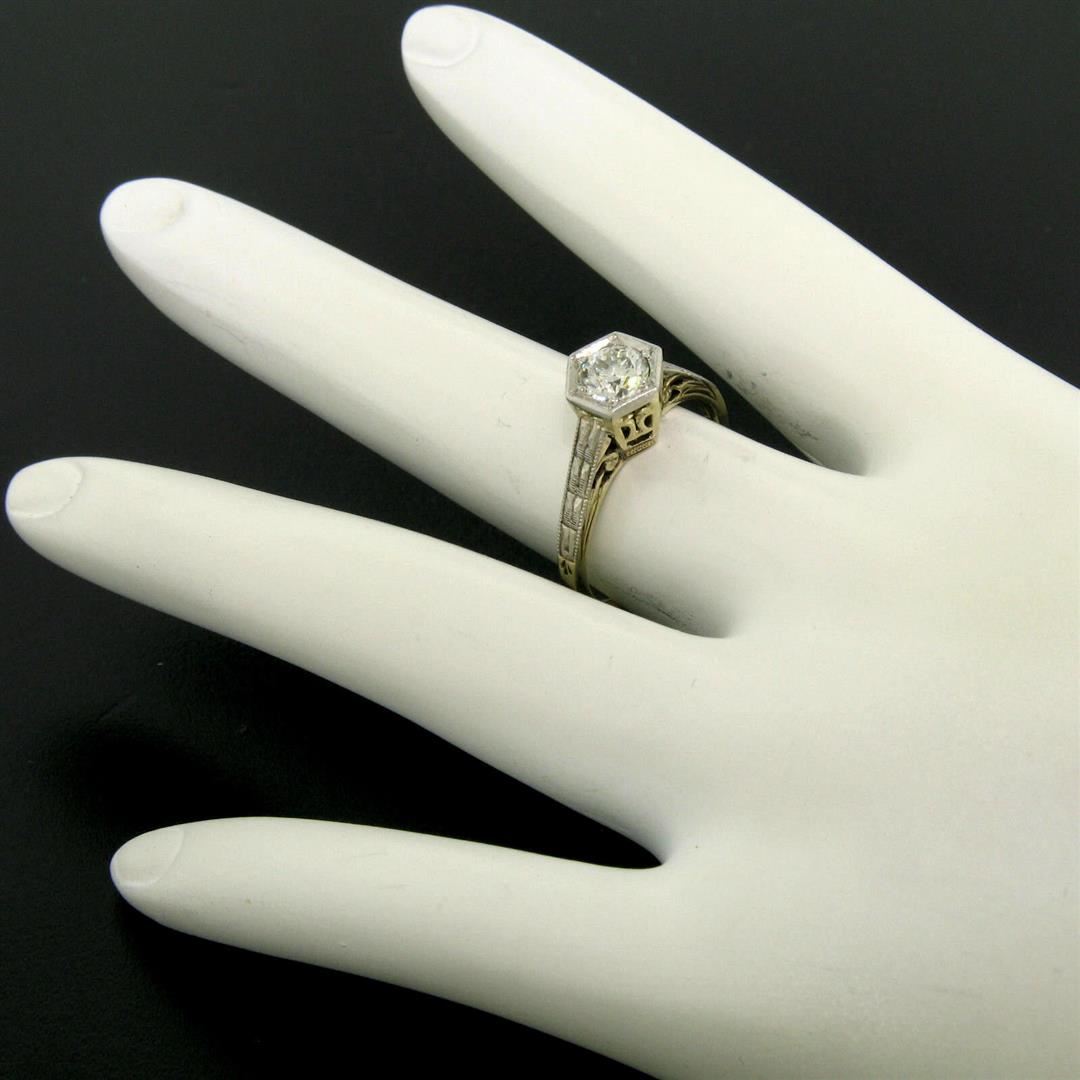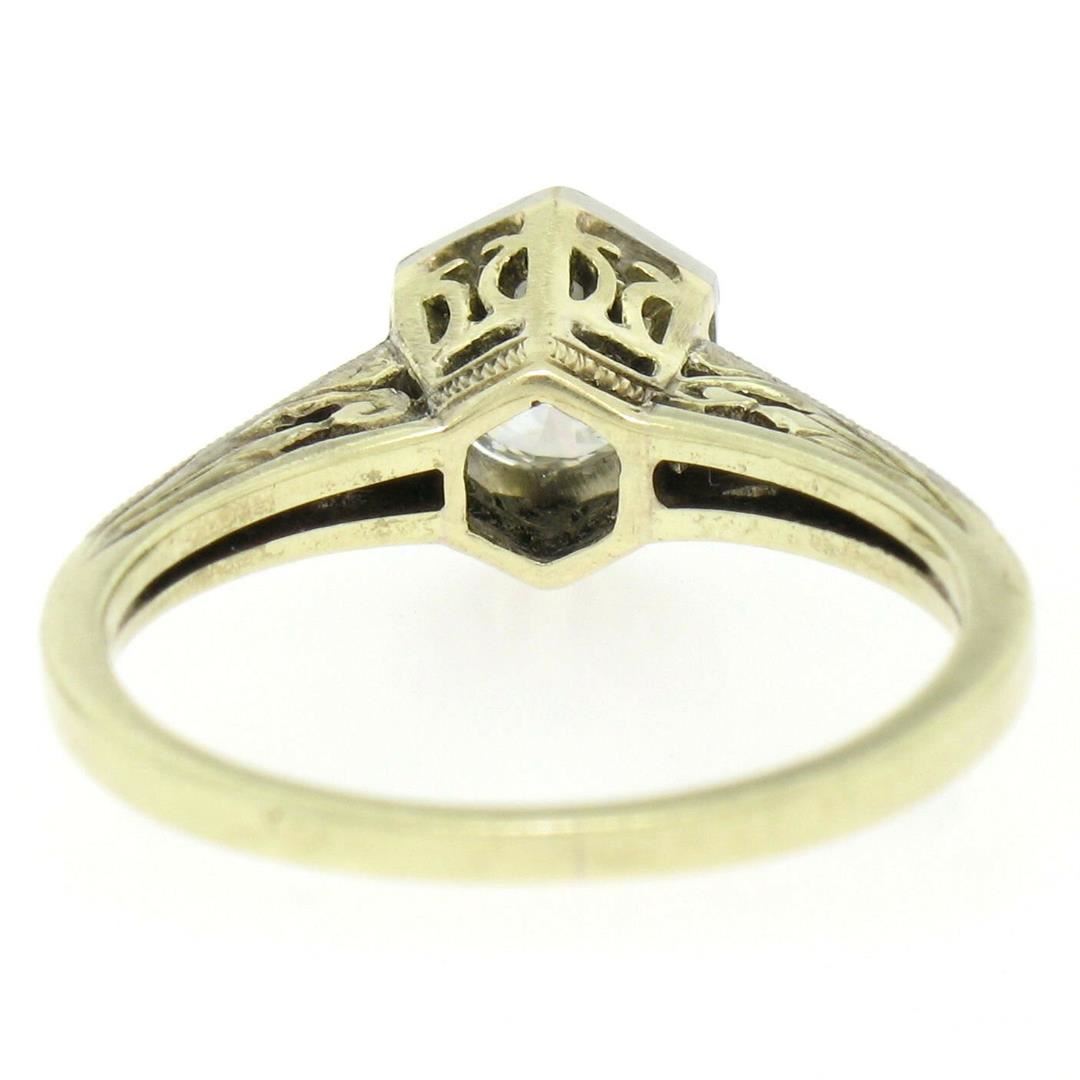 One Antique Art Deco 14k Gold & Platinum European Diamond Solitaire Engagement Ring. Item Details: Material: Solid 14k Yellow Gold w/ Platinum Top, Weight: 3.0 Grams, Stone(s): (1) Natural Genuine Diamond - Old European Cut - Bead Prong Set - E/F Color - VVS2/VS1 Clarity, Total Carat Weight: 0.50 (approx.), Ring Size: 6.0 (We can custom size this ring.), Ring Width: 7.54mm, Ring Height: 7.62mm rise off the finger, Condition: Excellent, ready to wear condition!