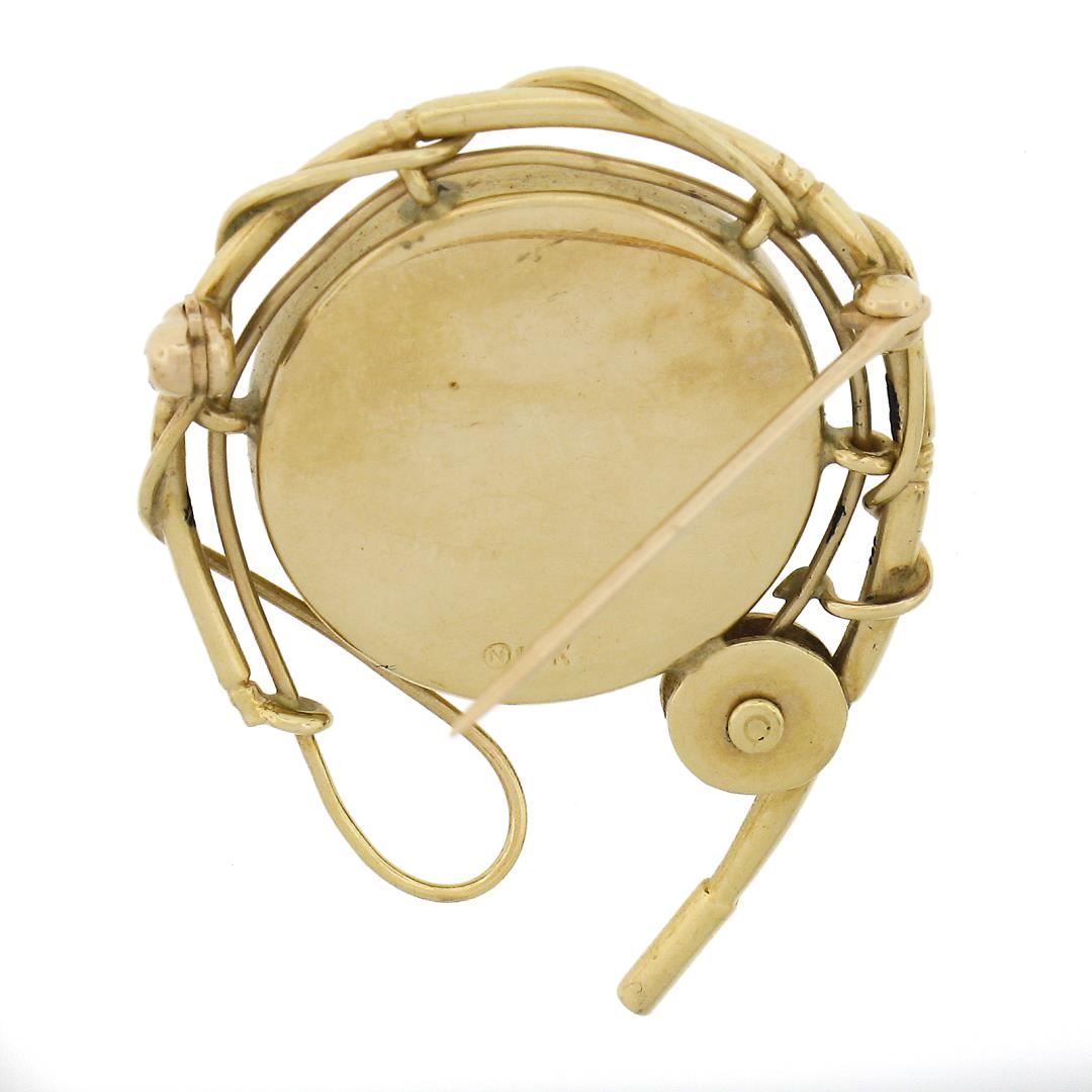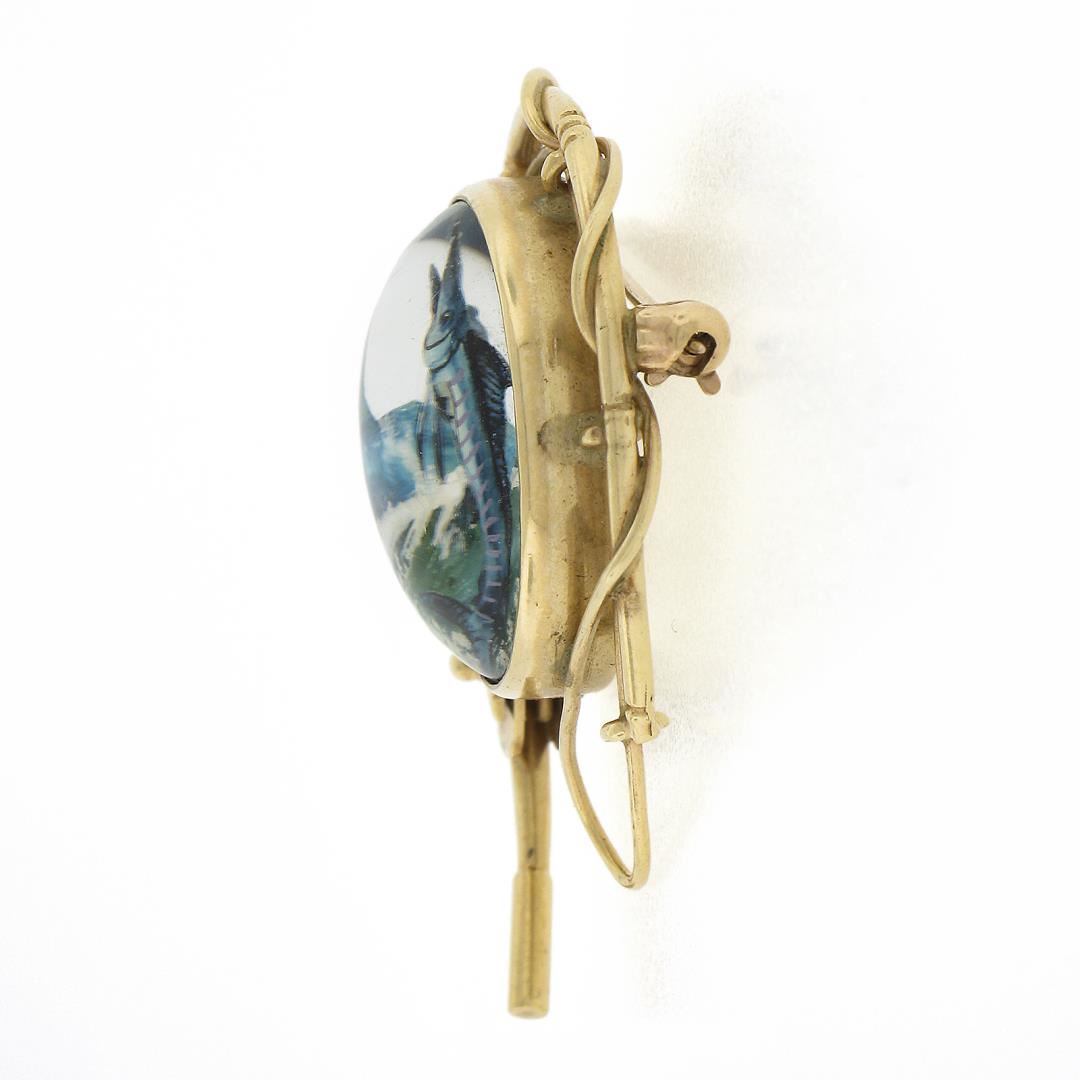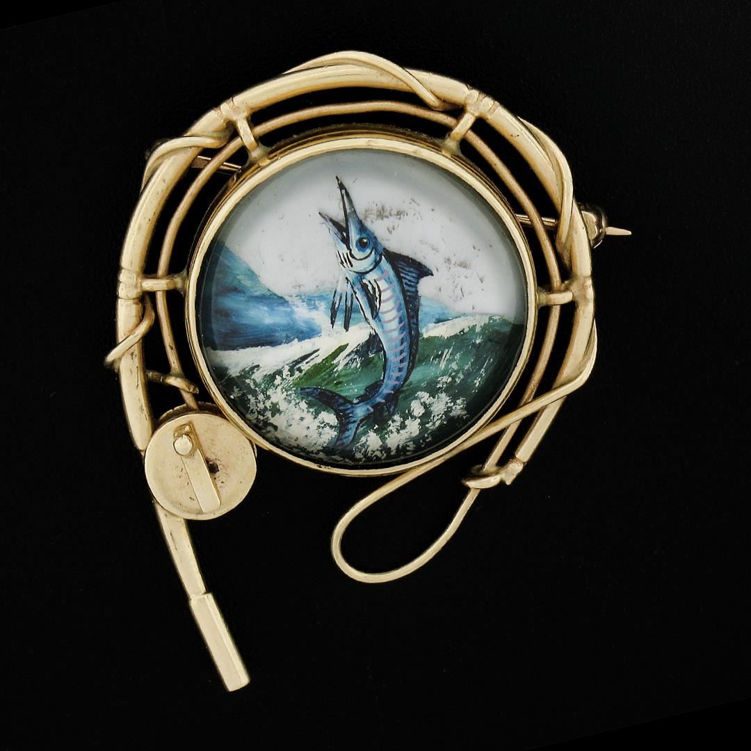 A solid 14k yellow gold fishing brooch, with intaglio painting scene. Measures 39.6x29mm and weighs a total of 11.21 grams.